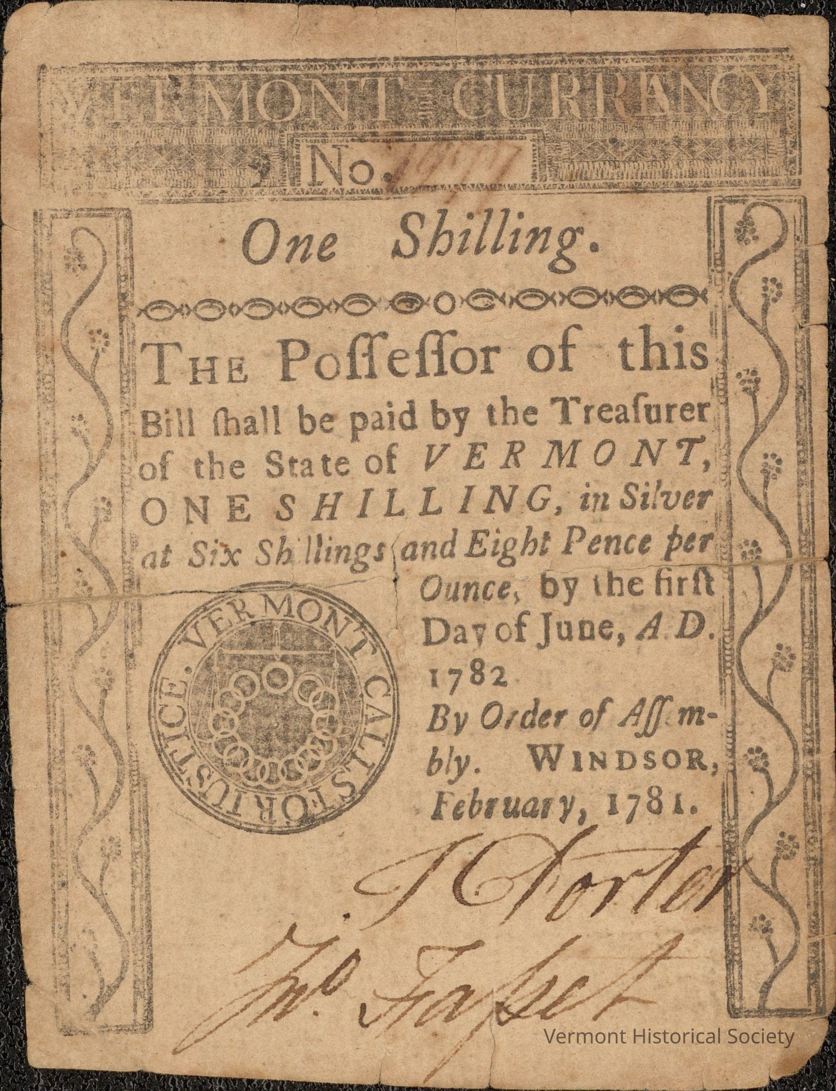 Paper money for 1 shilling. At the top within the dark border are the words, "VERMONT CURRENCY", with an A under the E in "currency". The serial number is 1977. In the center is the inscription, "One Shilling. The Poffeffor of this Bill fhall be paid by the Treafurer of the State of VERMONT, ONE SHILLING, in Silver at Six Shillings and Eight Pence per Ounce, byt he firft Day of June, A.D. 1782. By order of Affembly. Windsor, February, 1781." There is a circular seal with the words, "VERMONT CALLS FOR JUSTICE." The back of the bill reads, "ONE SHILLING. Death to counterfeit. WESTMINSTER: Printed by Spooner and Green. 1781."Acquisition
