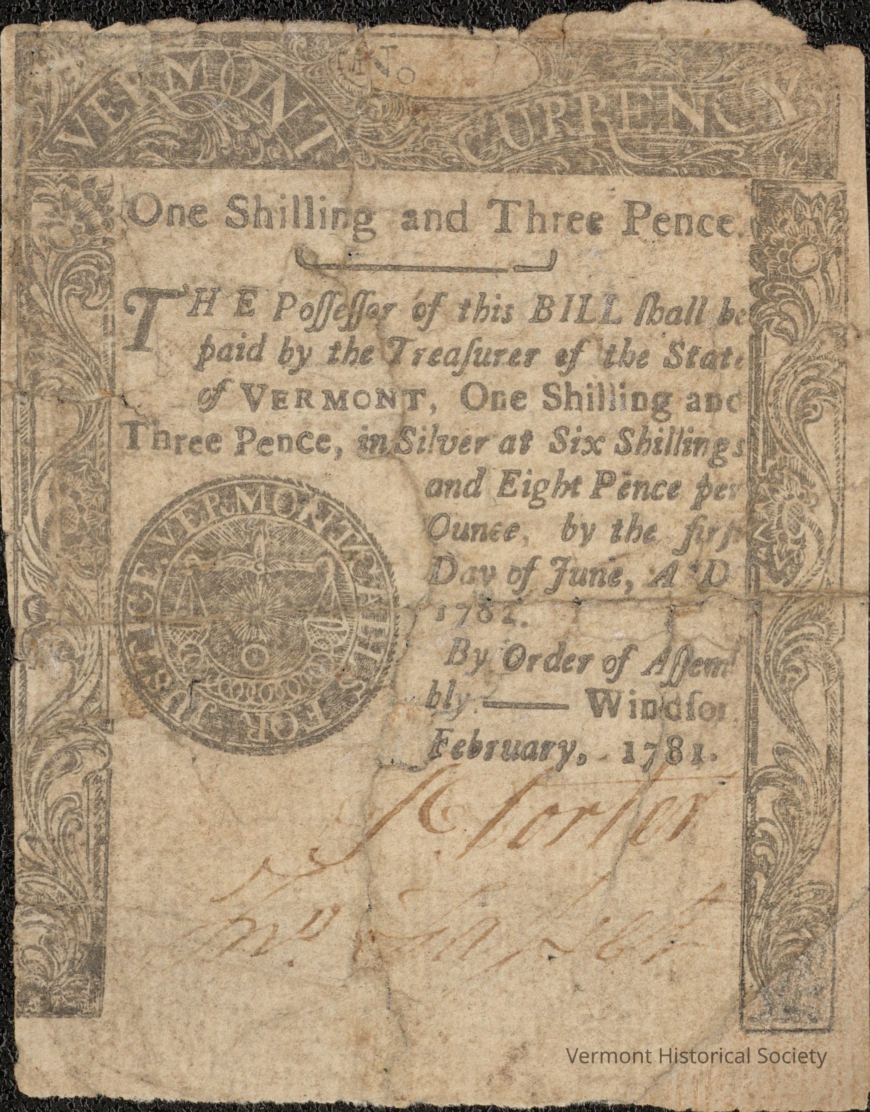 Paper money for 1 shilling and 3 pence. The serial number is illegible. One side has the inscription, "The possessor of this BILL shall be paid by the Treasurer of the State of Vermont One Shilling and Three Pence, in Silver at Six Shillings and Eight Pence per Ounce, by the first Day of June, A. D. 1782. By order of Assembly, Windsor, February, 1781." The other side is printed with the inscription, "Fifteen Pence / Death to counterfeit. / WESTMINSTER: Printed by Spooner and Green. 1781."Acquisition