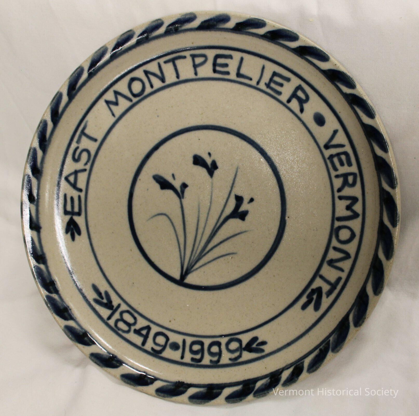 Large salt-glazed stoneware plate painted with the blue inscription, "EAST MONTPELIER VERMONT 1849.1999", and an simplistic painted of three flowers in the center. The border is painted with diagonal lines. The bottom is stamped, "Made in East Montpelier Vermont by Thistle Hill Pottery", and painted with a stick figure.Context