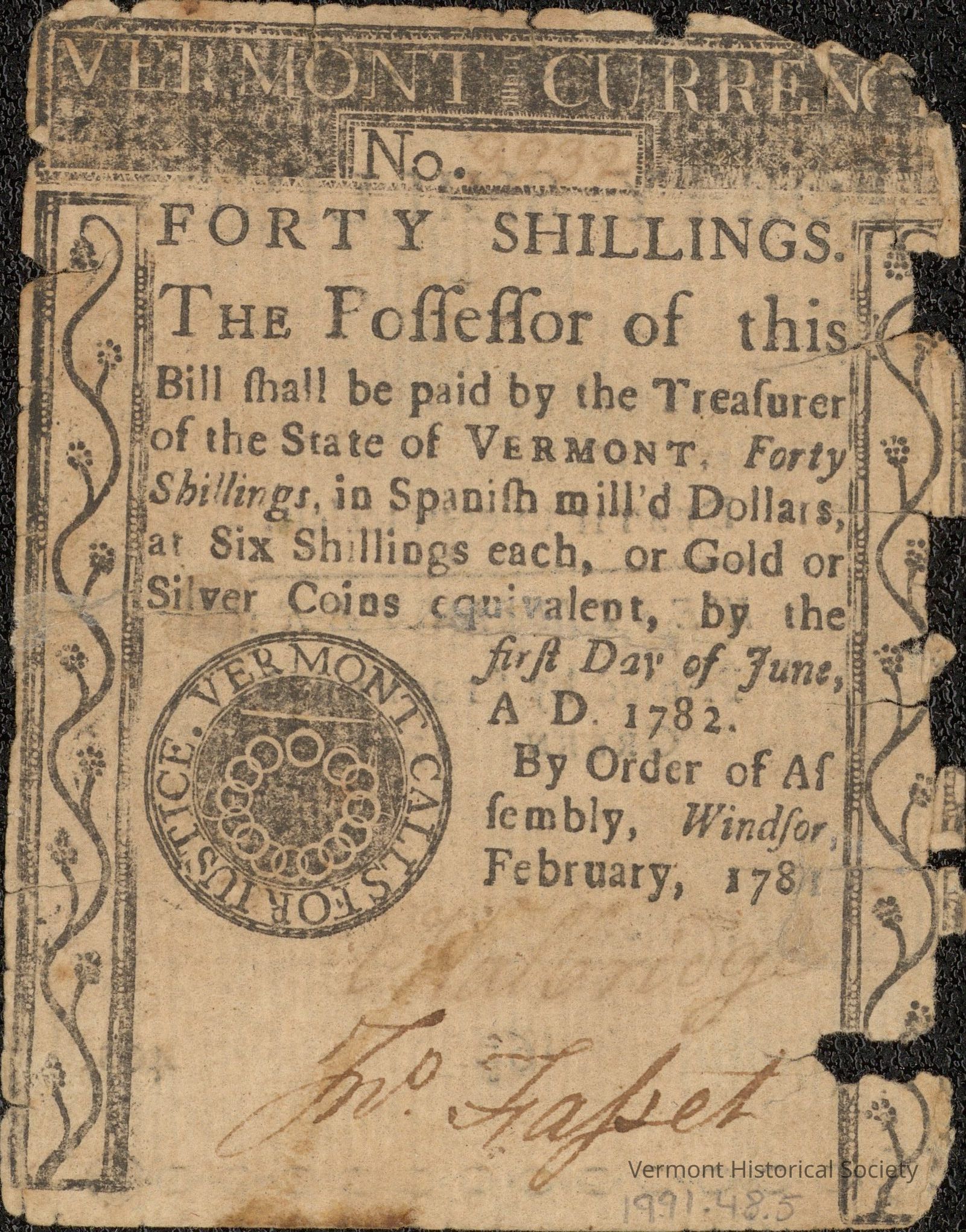 Paper money for 40 shillings. The front is printed with the words "VERMONT CURRENCY" in the upper border, along with the serial number 3232. The center has the inscription, "FORTY SHILLINGS. THE Poffeffor of this BILL fhall be paid by the Treafurer of the State of Vermont, Forty Shillings, in Spanifh mill'd Dollars, at Six Shillings each, or Gold or Silver Coins equivalent, by the firft Day of June, A. D. 1782. By Order of Affembly, Windfor, February 1781." It is signed "E. Walbridge" and "Jno. Fasset". The back is printed with the inscription, "FORTY SHILLINGS. Death to counterfeit. WESTMINSTER. Printed by Spooner & Green. 1781."Acquisition