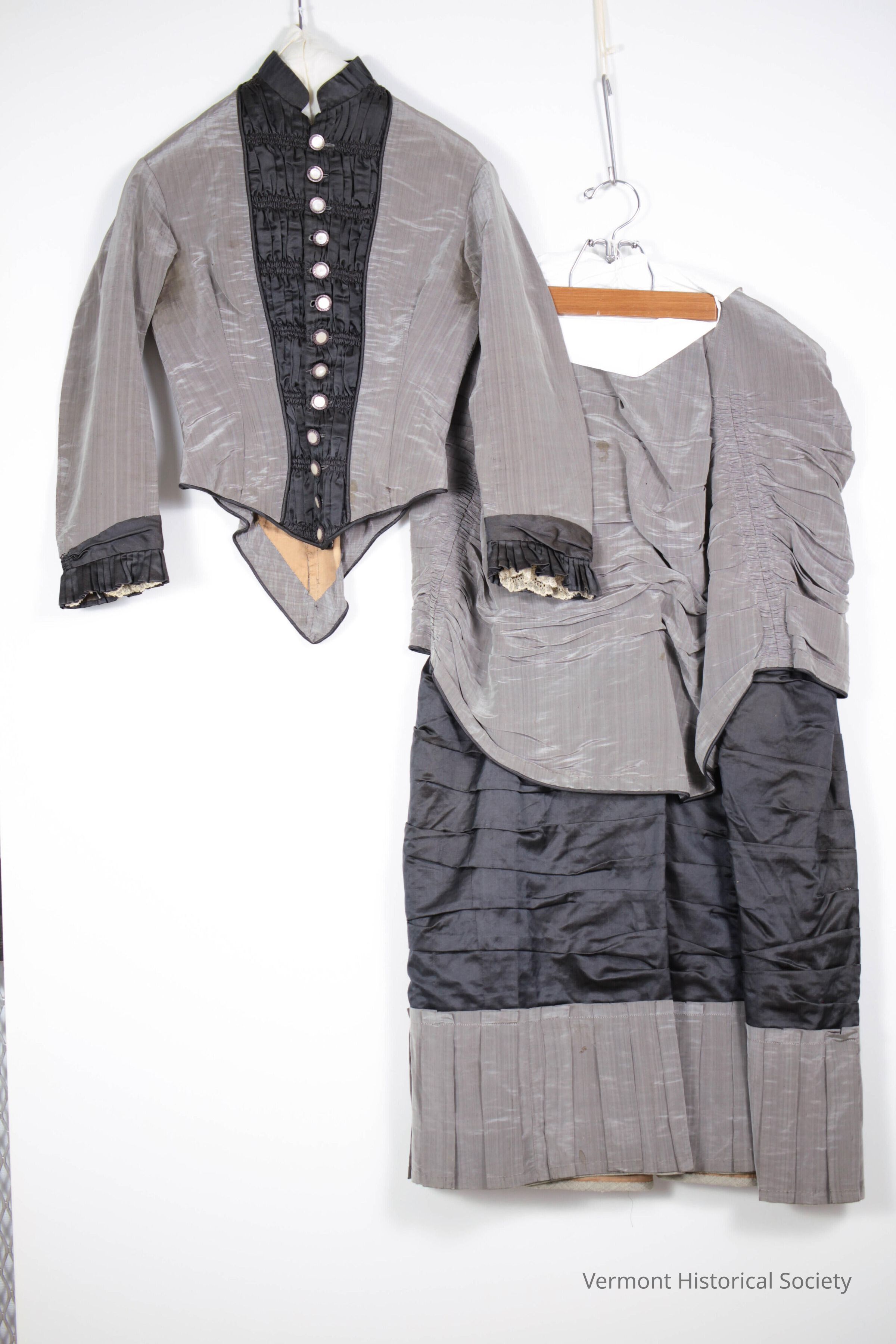Two-piece grey silk dress consisting of a bodice and skirt. The bodice has 3/4-length sleeves and opens up the center front with 13 metal buttons. The center front placket is made of black silk that is gathered around cords placed horizontally in line with every other button. The cuffs are decorated with pleated black silk and white lace. The hem is slightly pointed in the front and very pointed in the back. The skirt is made in one piece but styled to look like a petticoat and overskirt, with grey silk on the top and hem and black silk in the middle.Context