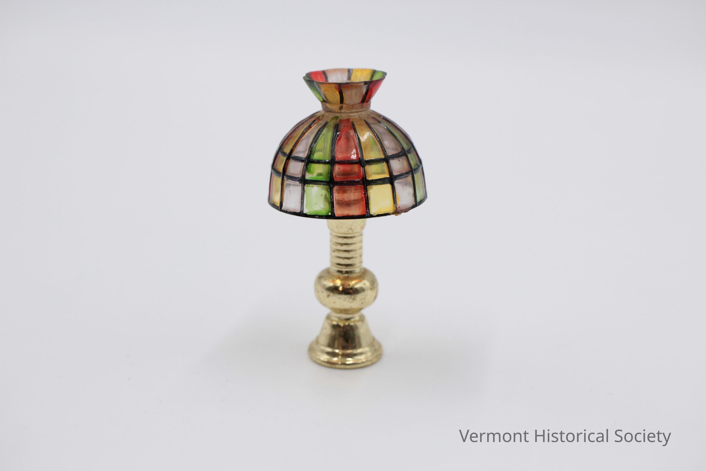 Miniature plastic table lamp with an imitation stained glass shade. The base of the lamp is gold colored. The shade is striped with red, green, purple, and yellow, separated by lines of black. The lamp is accompanied by its original box, which shows photographs of various glass-shaded table lamps and the words, "OLD FASHION STAINGLASS / MINI LAMP / NO. 8441 MADE IN HONG KONG".Context