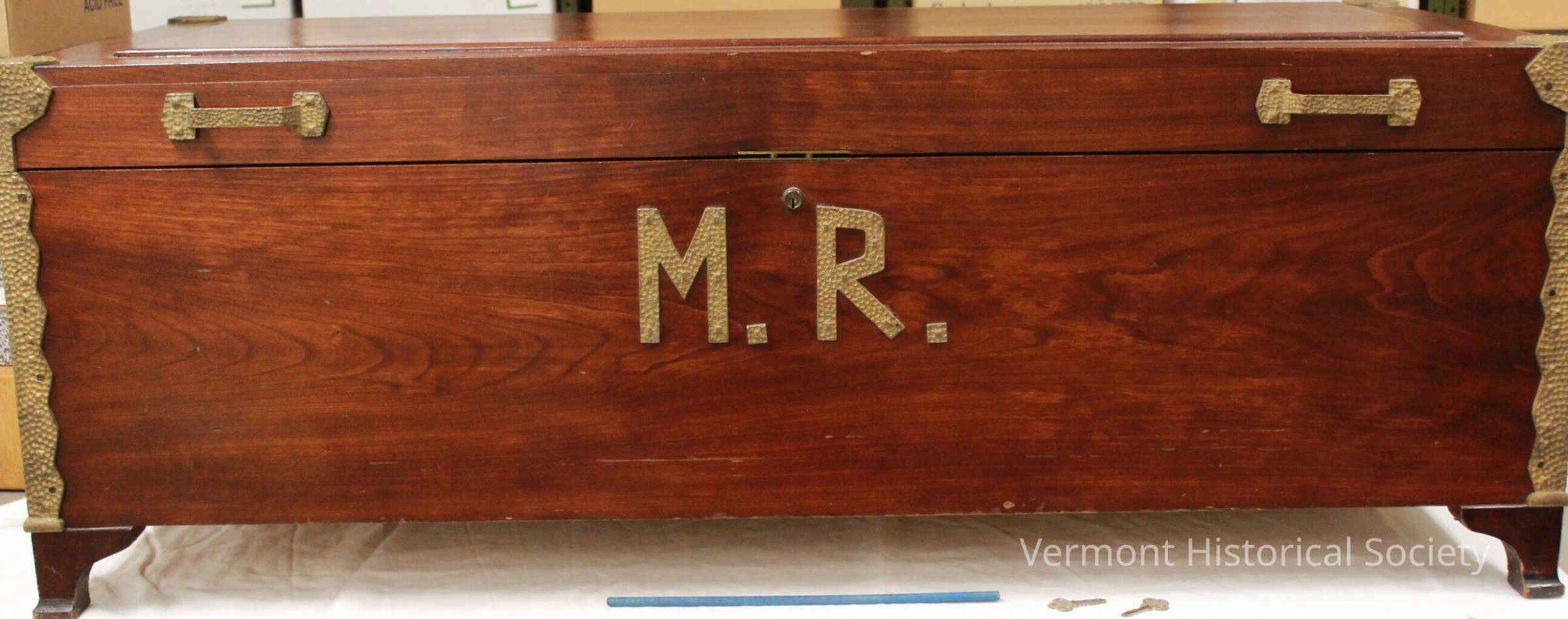 This is a blanket chest that features a paneled exterior lid/cover with decorative hammered brass finished metal protecting each of the four exterior corners. It has a medium dark stain. Inside the lid, there is a gold-colored plaque stating "This wood was taken from a log used by Col. Davis in building a dam in 1788 on the site now occupied by Lane MFG. Co." Additionally, there is a sliding cedar tray located inside the chest. The handles at each end of the chest and on the front of the lid are made of the same hammered metal as the corner protectors. On the front of the exterior, the initials "M.R." are also featured in hammered brass-colored metal, which stands for Maizie Rumsey. The plain bracket feet support the chest on each corner. The keyhole and lock on the chest are both made of brass, and the key to lock and unlock the chest is included with it.Context