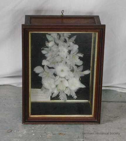 Funeral wreath of feather flowers within a deep shadow-box frame. The arrangement consists of several flowers and leaves, all made of silk and white feathers.