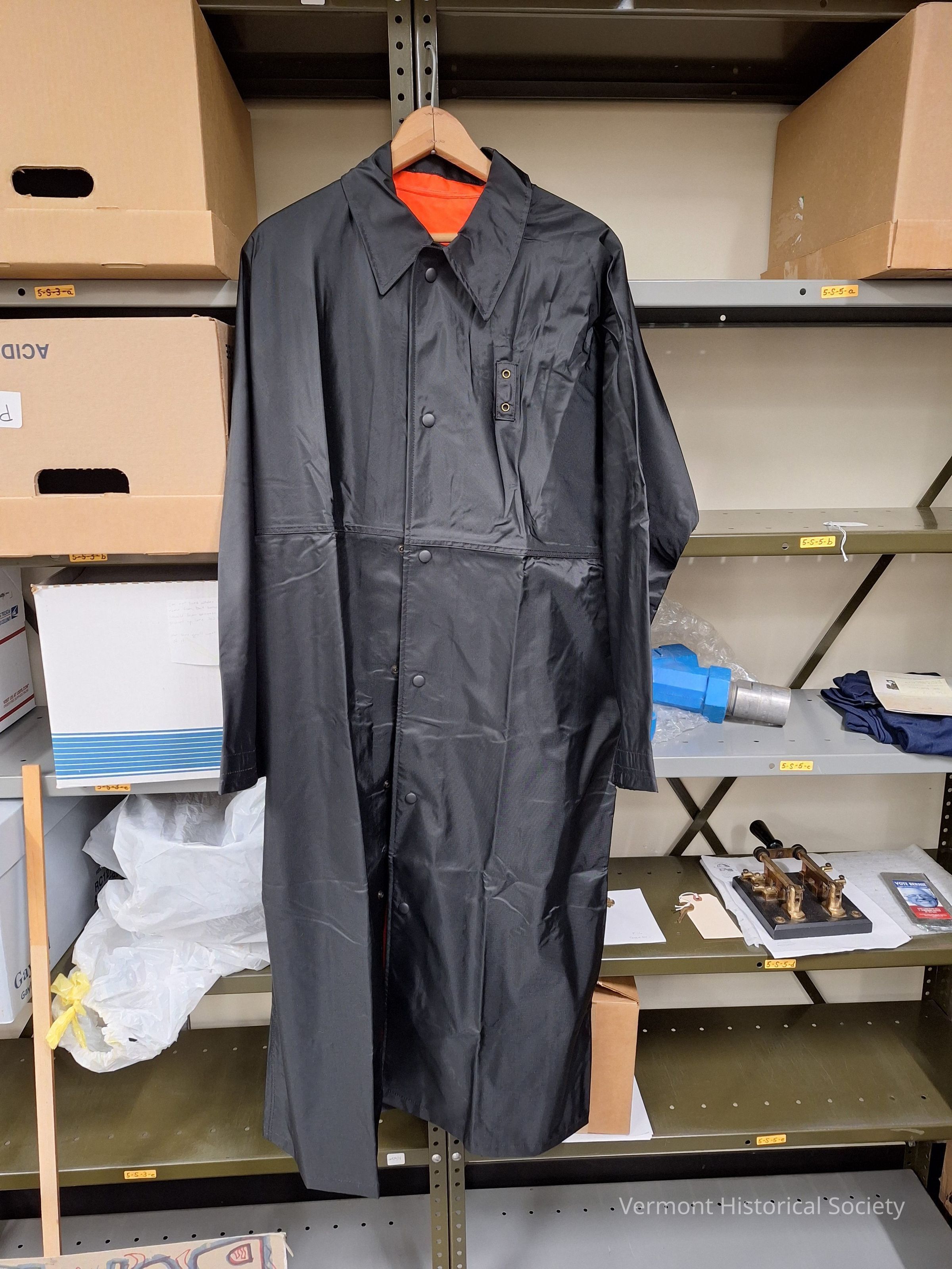 Calf-length raincoat. The raincoat is reversible with one side a shiny black water resistant polyester. It has a turned-down pointed collar and snap closures down the front. There is a badge loop on the left breast pockets area and Velcro slits at each hip for pocket access. The jacket can be turned outside-in to show a neon orange surface with a reflective band around the waist and the words "STATE / POLICE" printed in black across the back.