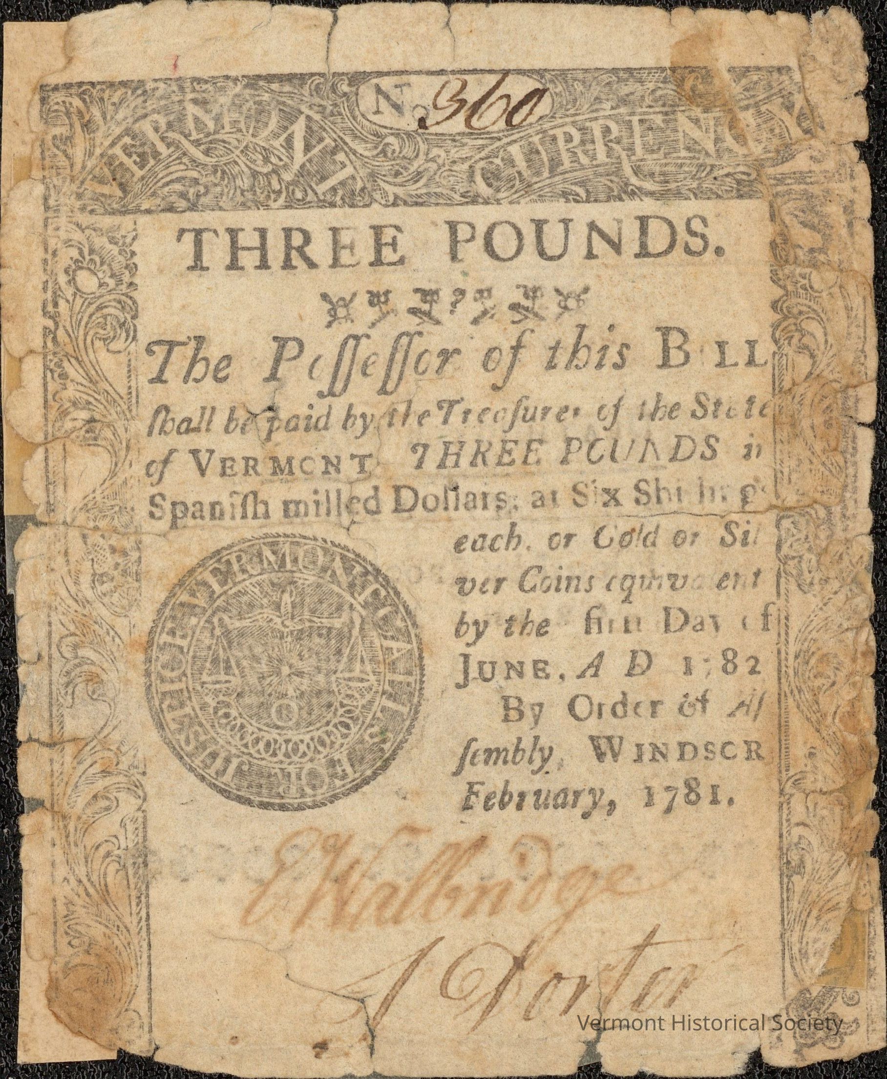 Paper money for 3 pounds. The front is printed with the words "VERMONT CURRENCY" in the upper border, along with the serial number 360. The center has the inscription, "THREE POUNDS. THE Poffeffor of this BILL fhall be paid by the Treafurer of the State of Vermont, THREE POUNDS, in Spanifh mill'd Dollars, at Six Shillings each, or Gold or Silver Coins equivalent, by the firft Day of June, A. D. 1782. By Order of Affembly, Windfor, February 1781." It is signed "E. Walbridge" and "J. Porter". The back is printed with the inscription, "THREE POUNDS. Death to counterfeit. WESTMINSTER. Printed by Spooner & Green. 1781."Acquisition