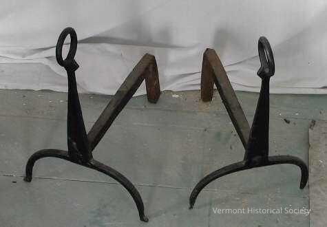 Pair of wrought iron andirons. Each is faced with a vertical bar shaped like a strap hinge and topped with a ring.