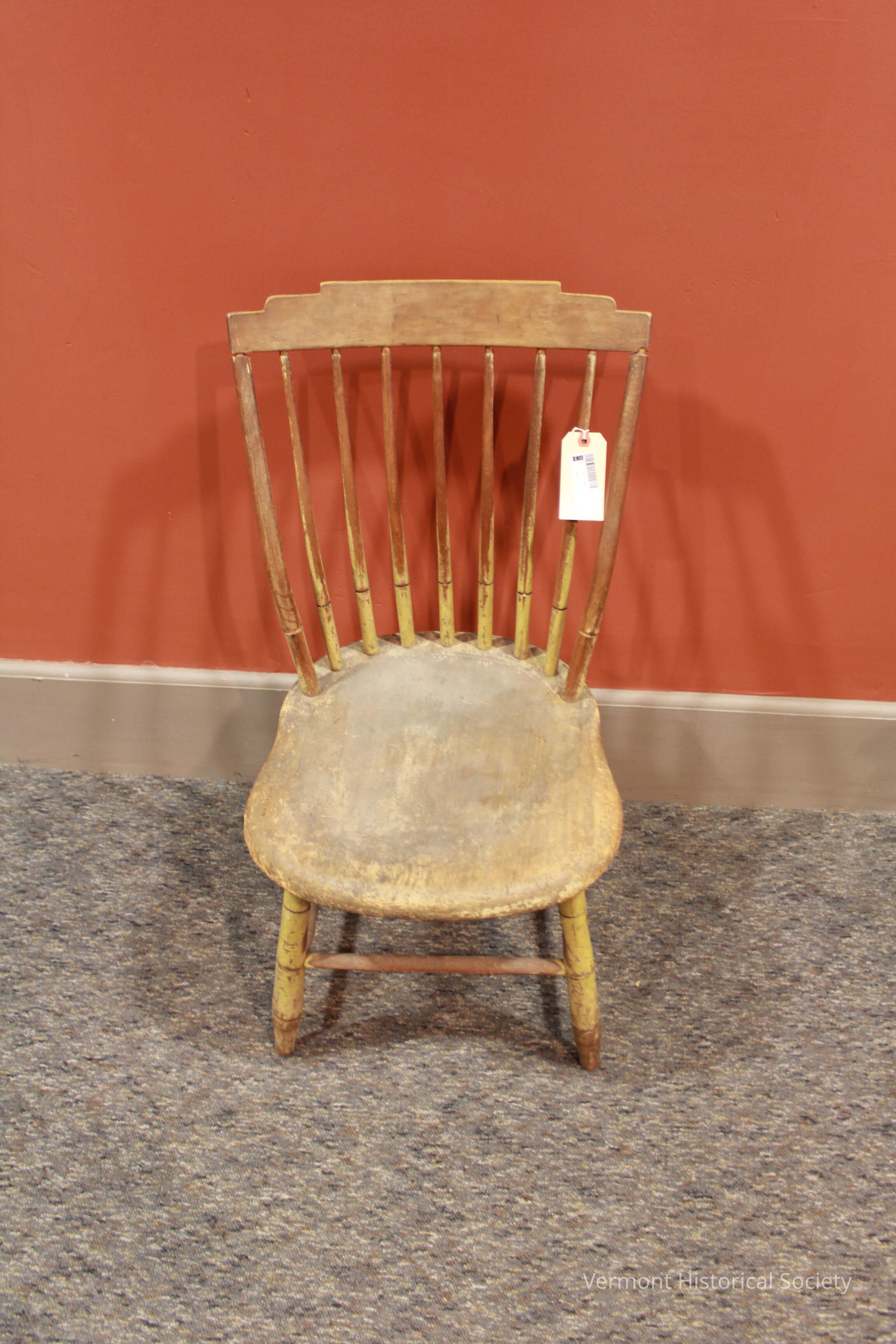 Fan back Windsor chair with stepped crest rail. Some of the original yellow paint remains, showing horizontal strips in imitation of bamboo.