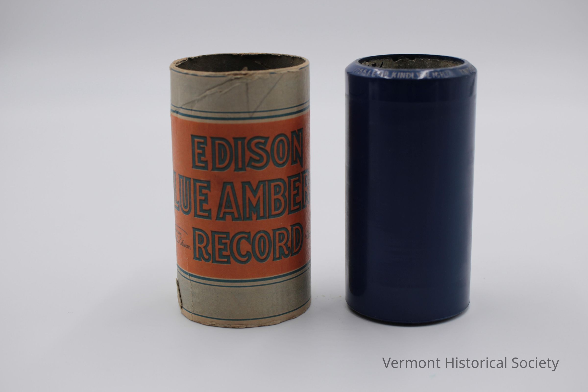 Black phonograph cylinder with a cardboard case. The cylinder, or "record", is a hollow cylinder consisting of hard, blue, ridged celluloid around a concrete core. One edge of the cylinder is labeled in white with the words, "1755 LEAD KINDLY LIGHT. KNICKERBOCKER QUAR. / Thomas A Edison PAT'D. 24."Use