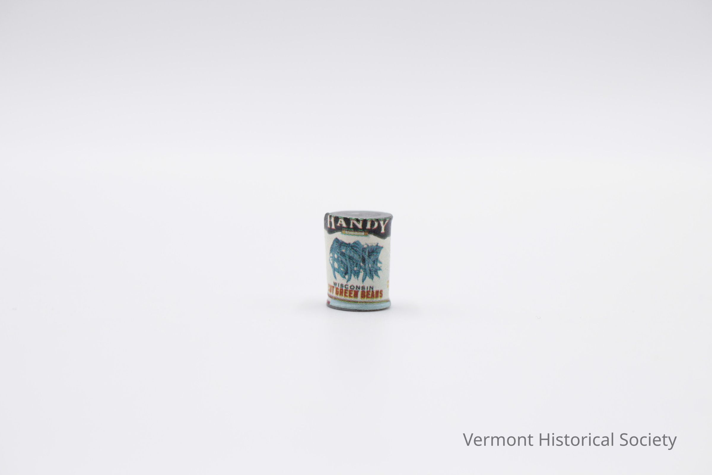 Miniature cylindrical food-storage can. The can is made of silver-colored plastic and is wrapped with a printed paper label. One side of the paper label shows several green beans with the words, "HANDY WISCONSIN CUT GREEN BEANS". The other side shows a woman in a shop uniform gesturing to some shelves with the words, "HANDY CUT GREEN BEANS".Context