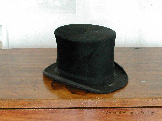 Black top hat lined with white satin. The interior crown is labeled "F. E. Hartwell" and "EXTRA QUALITY Trade Mark / Dunlop & Co. / copyrighted Brooks and Company / New Haven, Conn."
