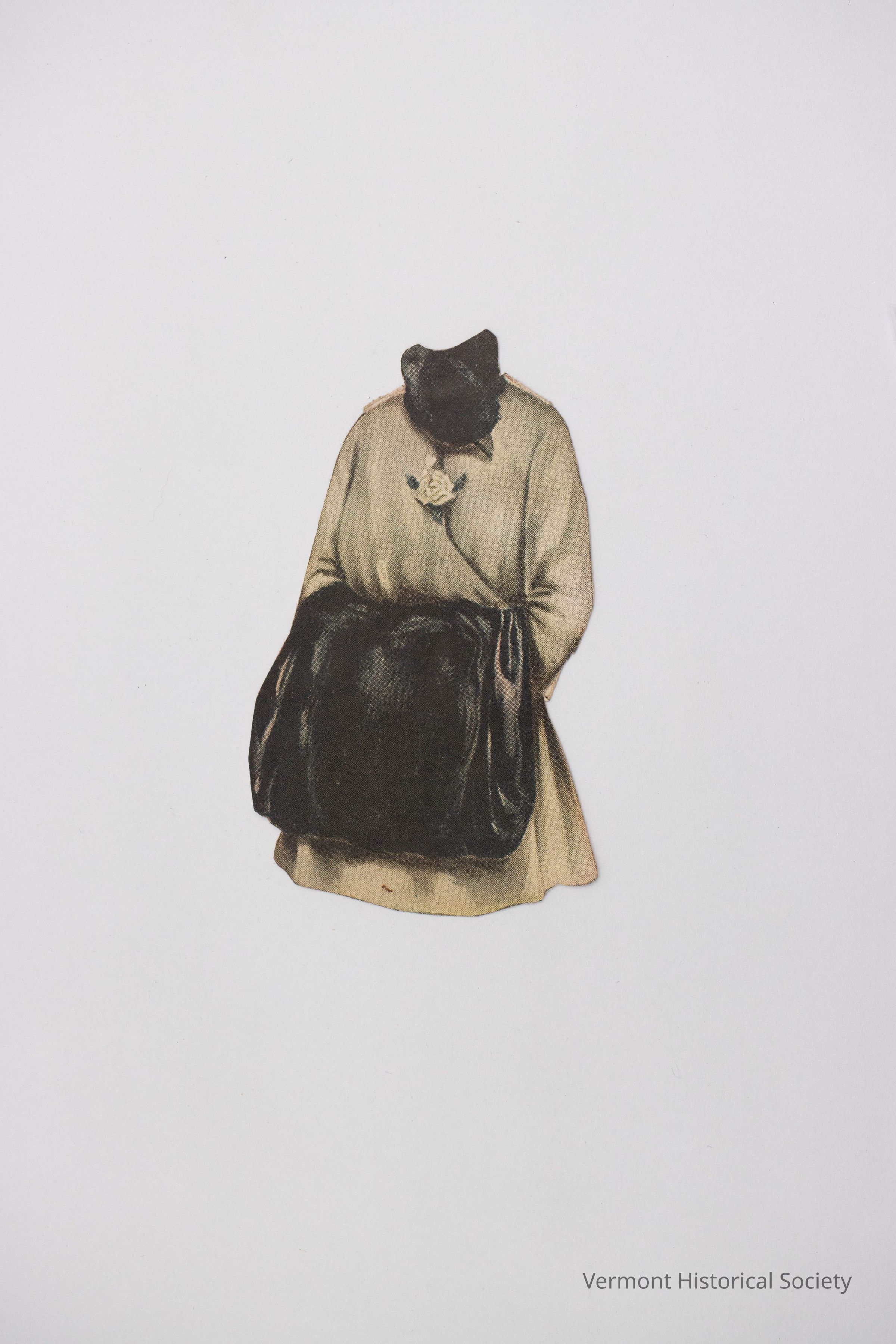 Printed paper coat dress for a paper doll. The coat is grey with a black collar and large black muff in front. The back shows a portion of a sales catalog page.Context