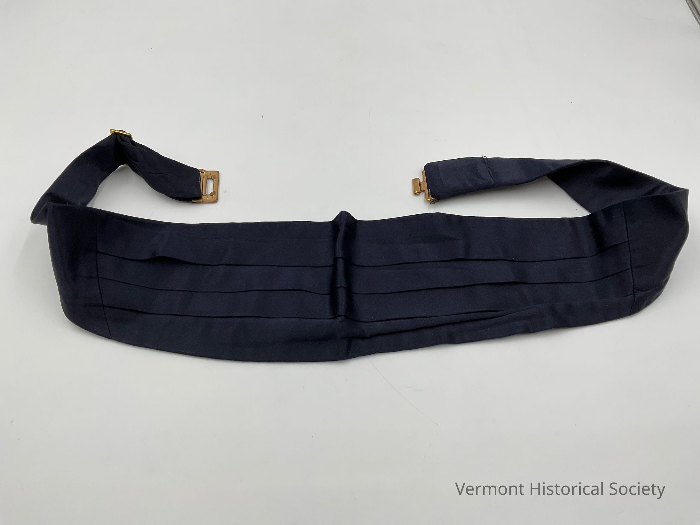 Navy blue cummerbund with 3 horizontal pleats. It secures at the back with a brass buckle. There is a tag on the inside that reads, "Louis /STYLE BY George-Wally / BOSTON . NEW YORK".