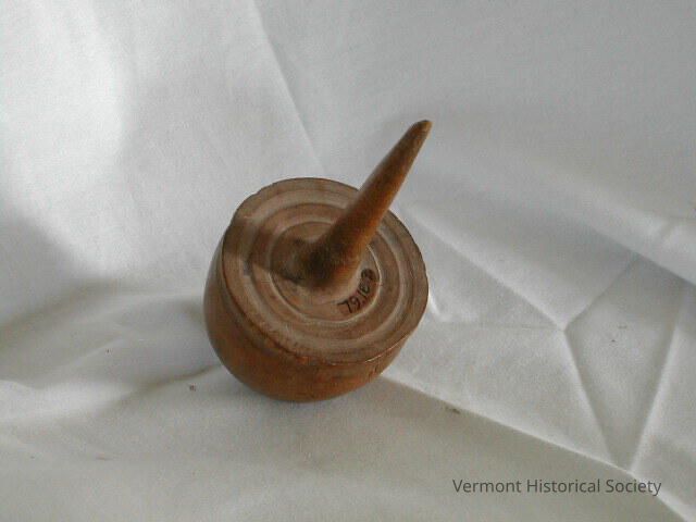 Wooden top, shaped like an acorn. The top is turned from a single piece of wood, with a narrow handle extending from the center top.Context