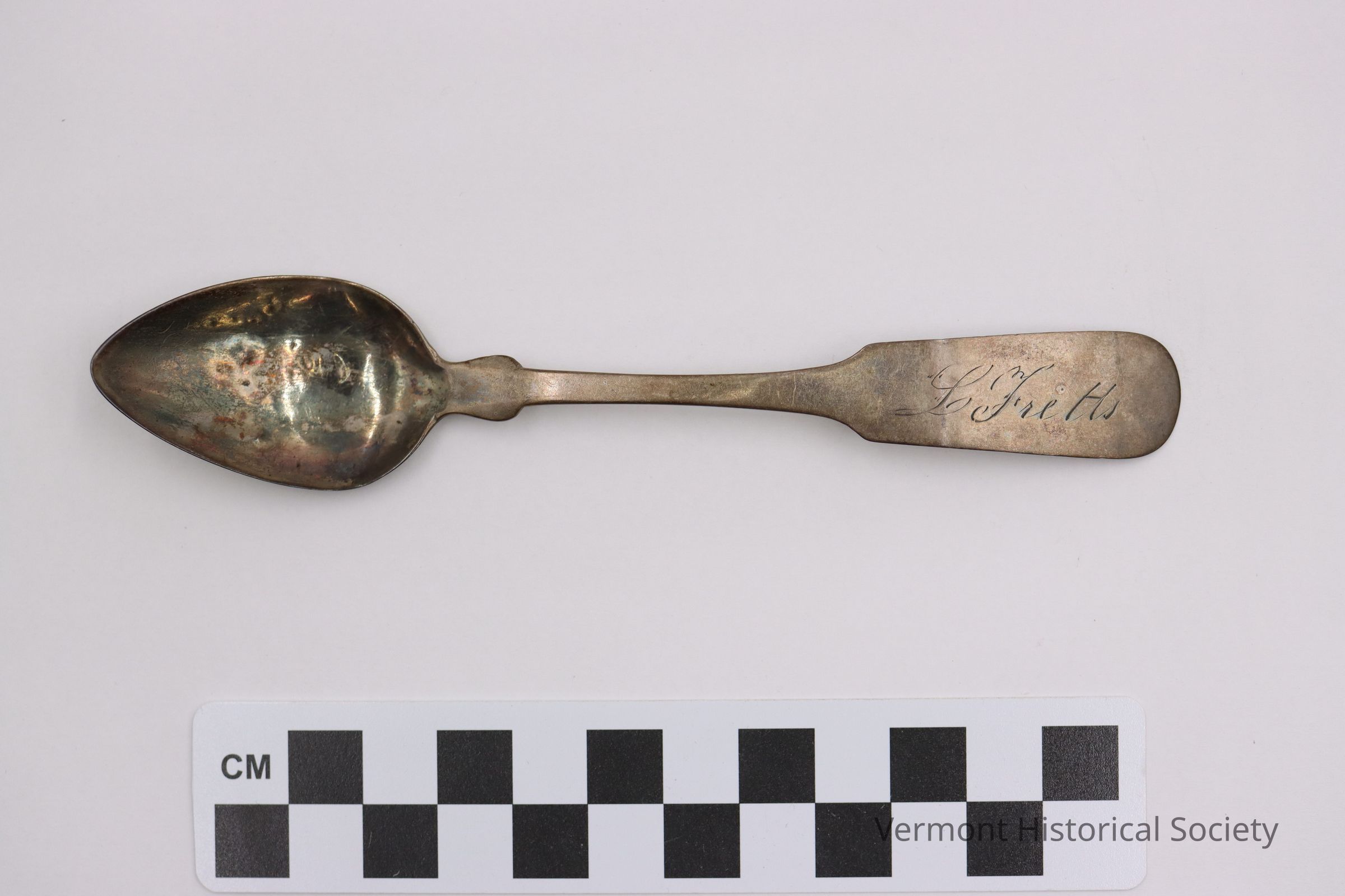 Coin silver teaspoon with a slightly pointed bowl and round shoulders. The handle is engraved with the name, "L. Fretts". The back of the handle is marked "N. Harding".