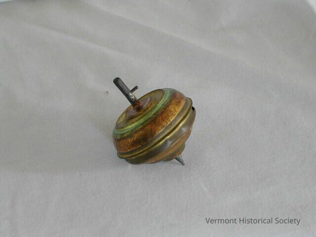 Painted tin top. The top is round in the middle, with a metal stake through the center that comes to a point on the bottom. It is painted in stripes of green, yellow, and orange.Context