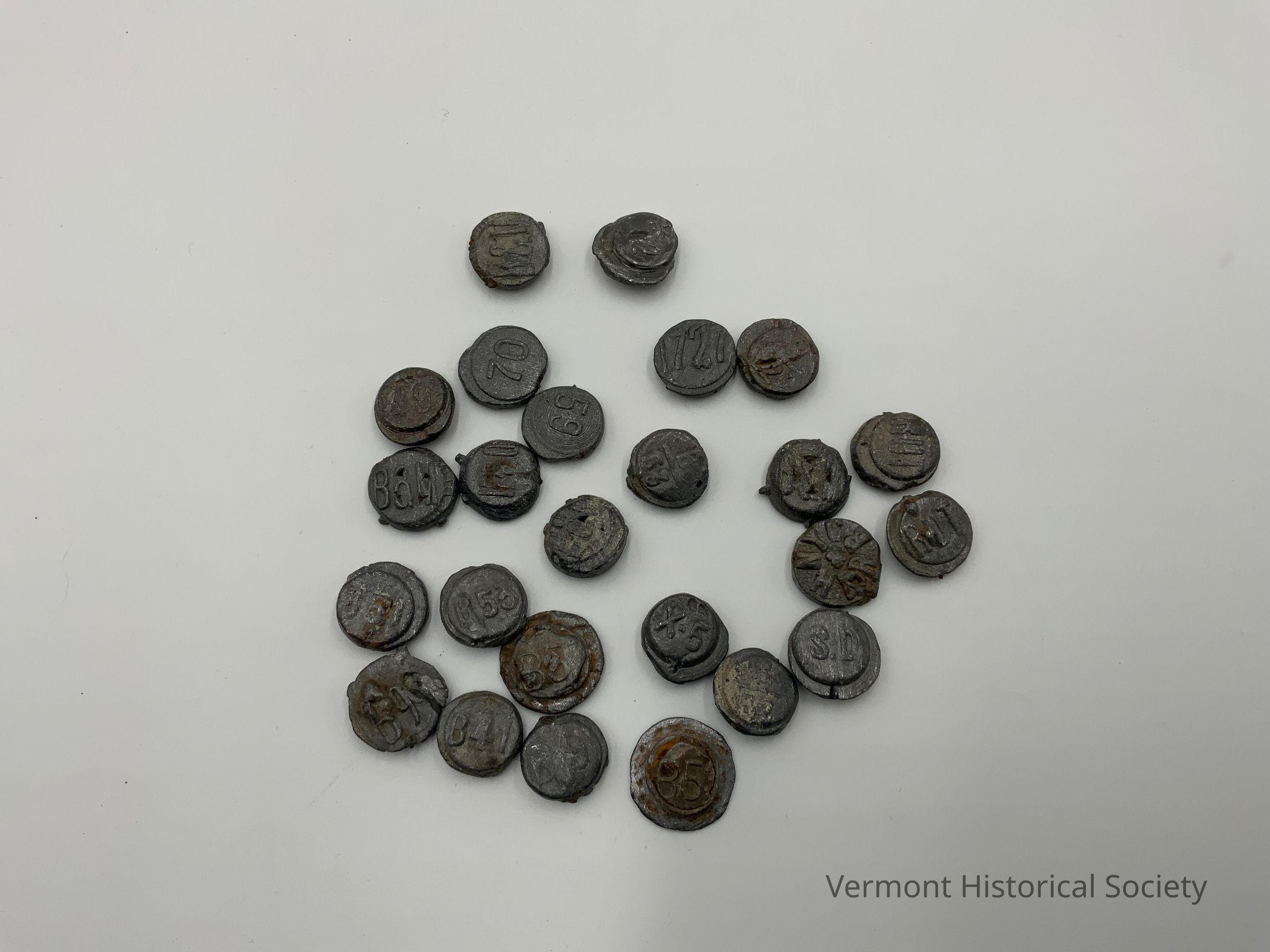 25 metal bale markers. The markers are small metal circles, each stamped with a number or initials.