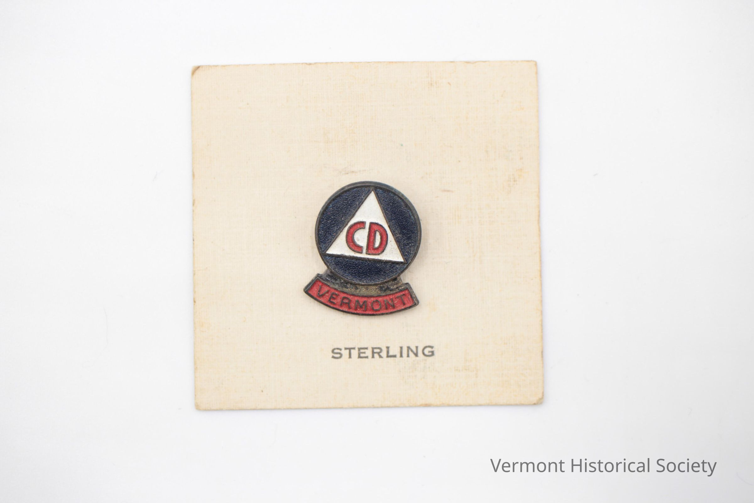 Blue, red and white pin. The pin is a blue circle with white triangle inside and the red letters CD. The word Vermont is in a red bar beneath the circle. The pin is on a thin cardboard with the word, "sterling" written on it.