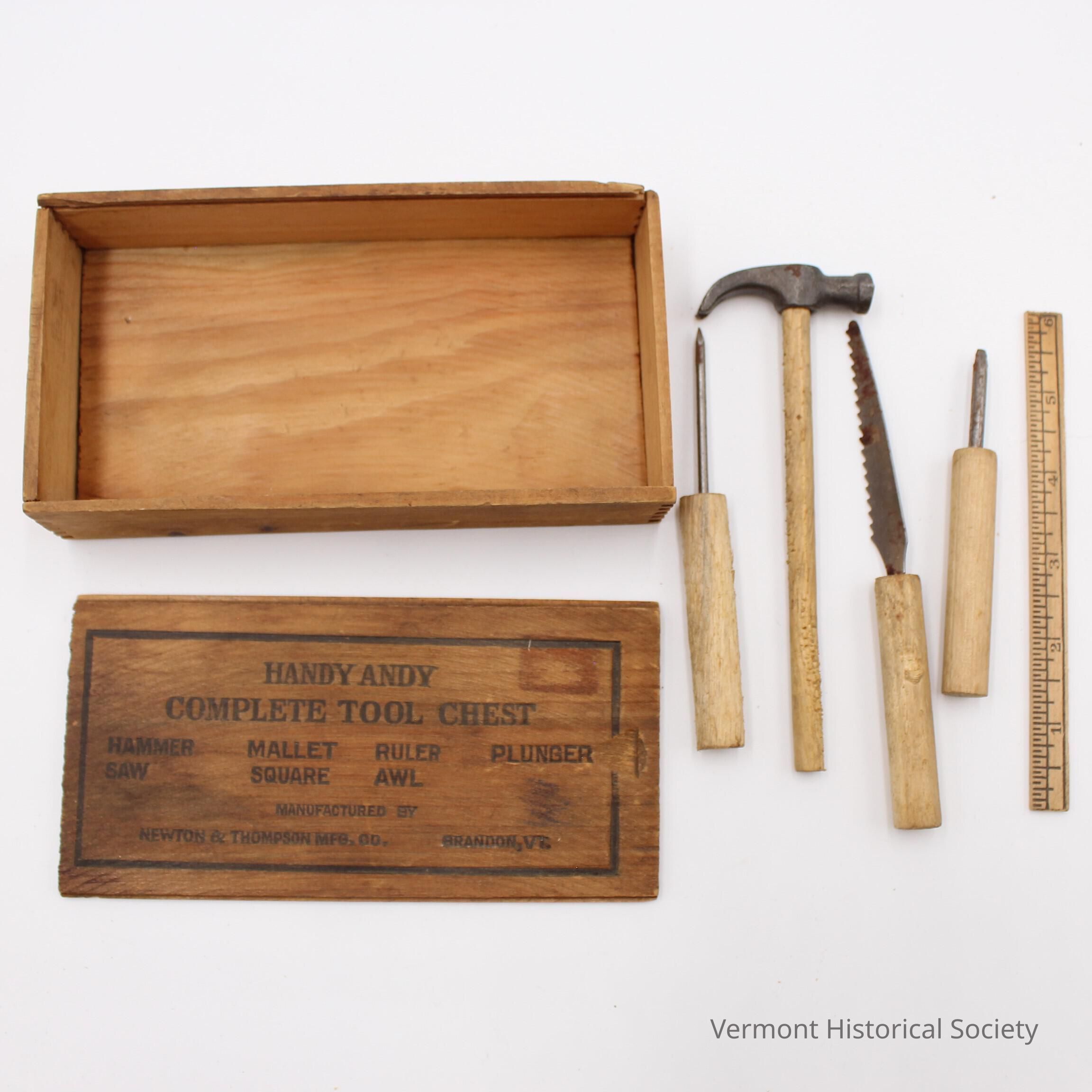 Wooden box containing miniature wooden and metal tools. The tools include a ruler, a screwdriver, a saw, a hammer, and an awl. The lid is printed with the name of the set ("HANDY ANDY COMPLETE TOOL CHEST") and the contents.Context