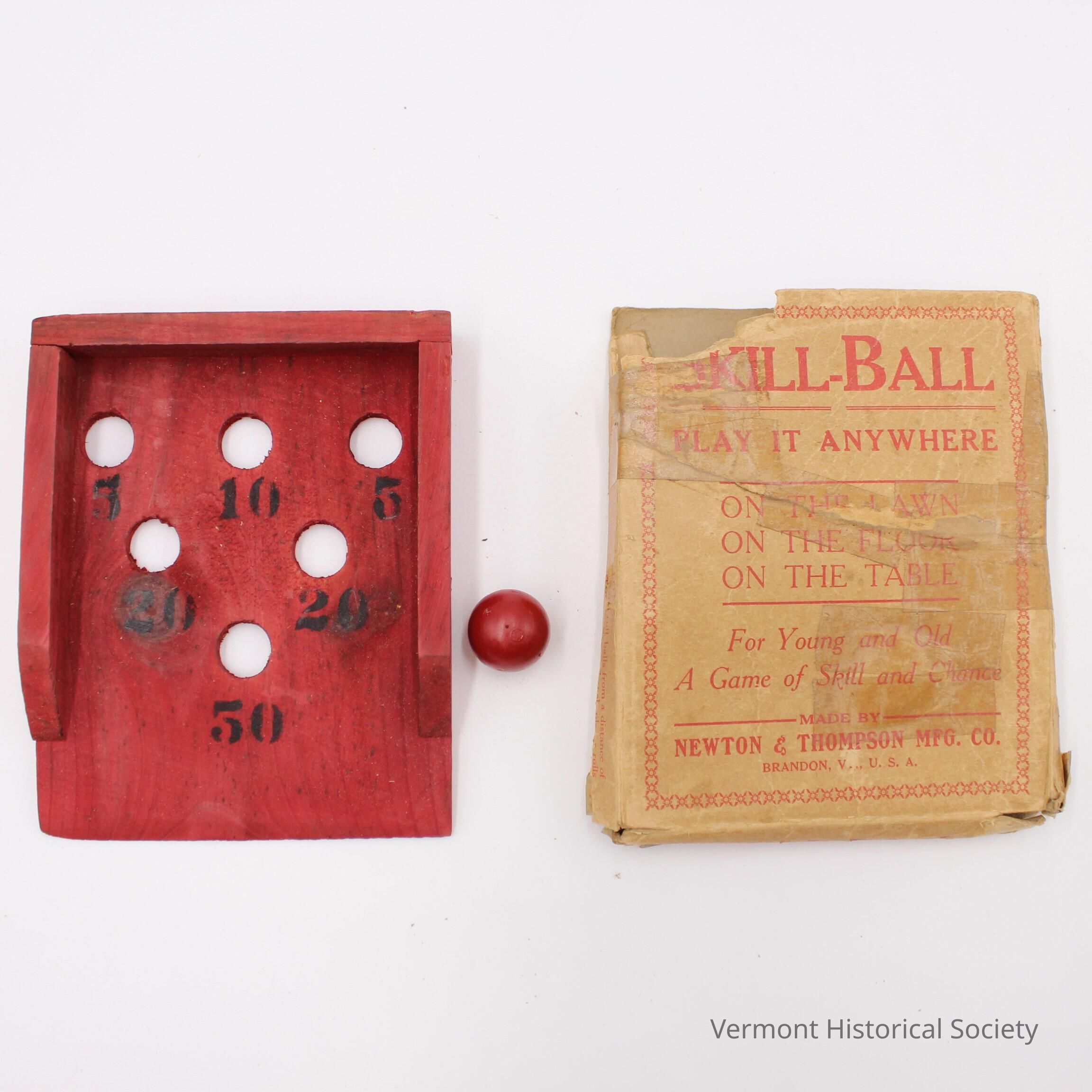 Small, tabletop skill ball set consisting of a board, a ball, and a box. The board is painted red and has a raised border on three sides. The fourth side is chamfered to create a ramp. There are 6 holes drilled into the board, labeled "5, 10, 5, 20, 20, 50". The ball is painted red. The box has the inscription, "SKILL-BALL PLAY IT ANYWHERE ON THE LAWN ON THE FLOOR ON THE TABLE For Young and Old A Game of Skill and Chance".Context