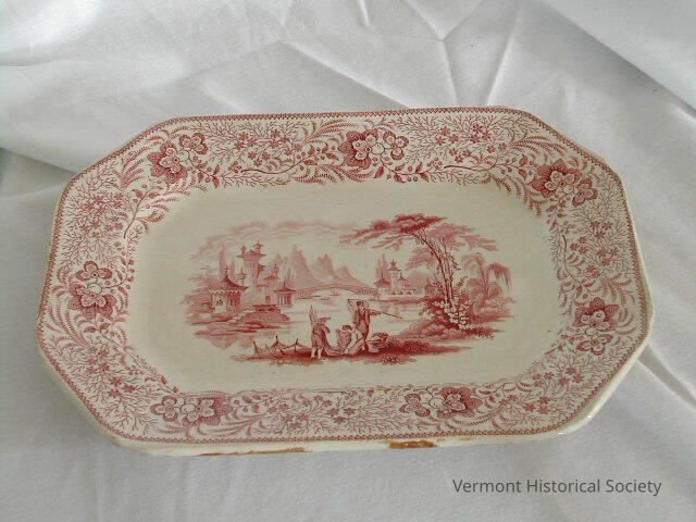 Red-and-white transfer-printed platter. The center is printed with a scenic design showing people beside a river with pagoda-style buildings on the opposite shore. The rime is printed with chintz-style flowers.