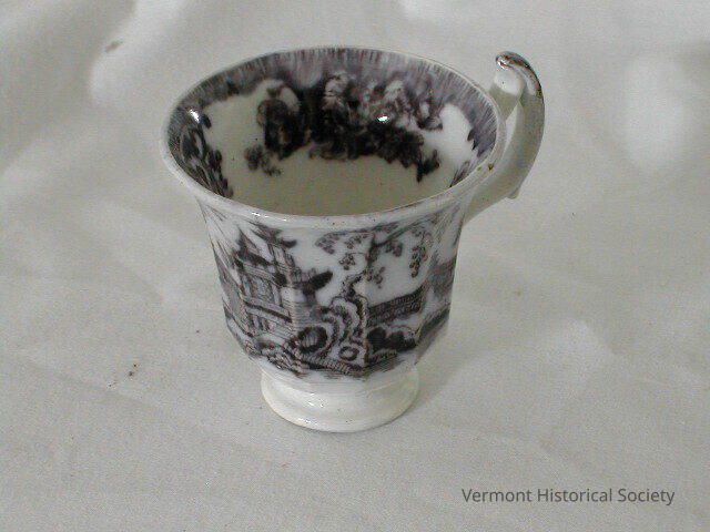 Transfer-printed teacup with handle and base. The design is printed in black and features pagoda-style buildings and trees. The print is smudged and running.