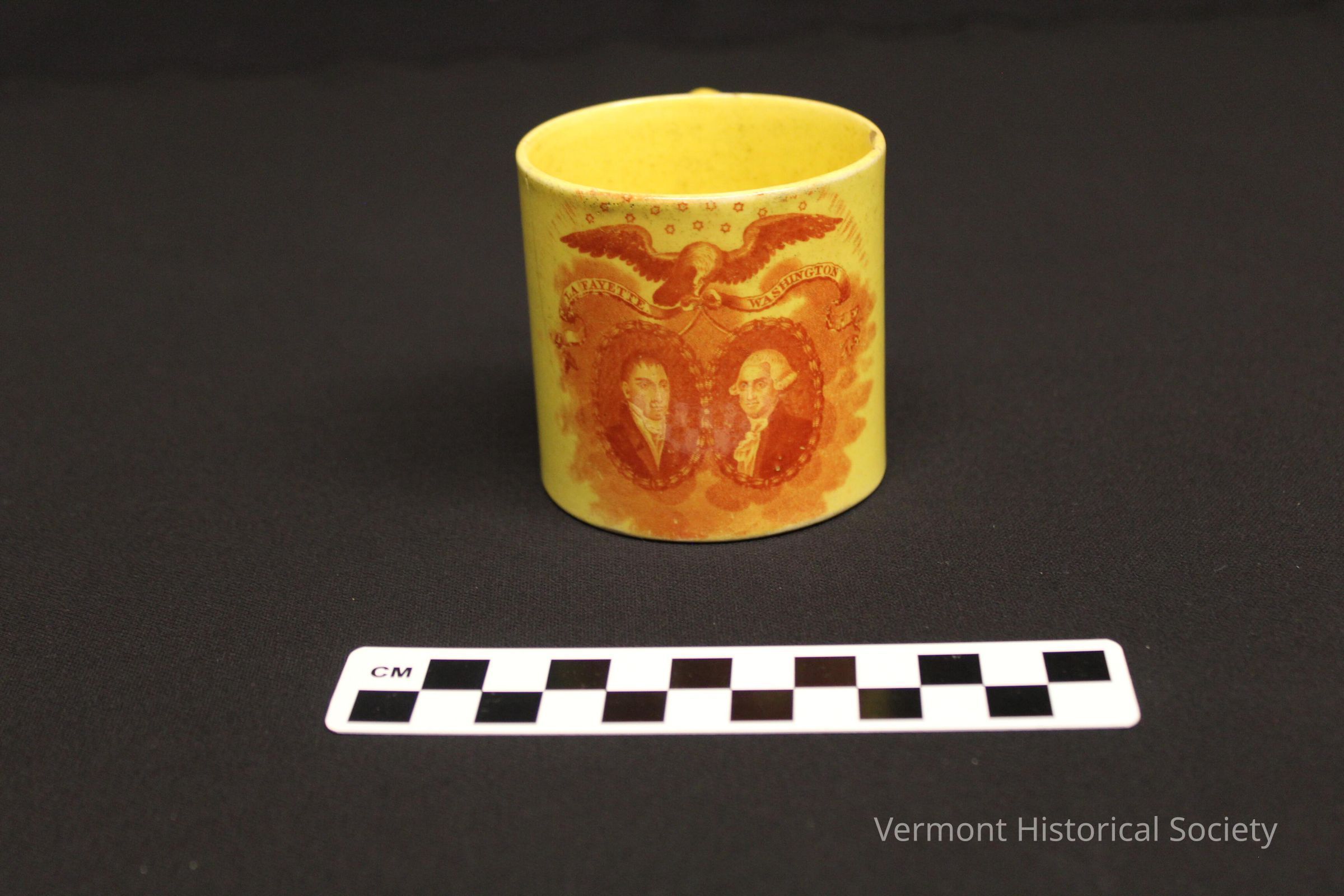 Small yellow cup with straight sides and a small handle. The cup is transfer printed in red with two portrait busts within ovals underneath a flying eagle. The portraits are labeled Lafayette and Washington.