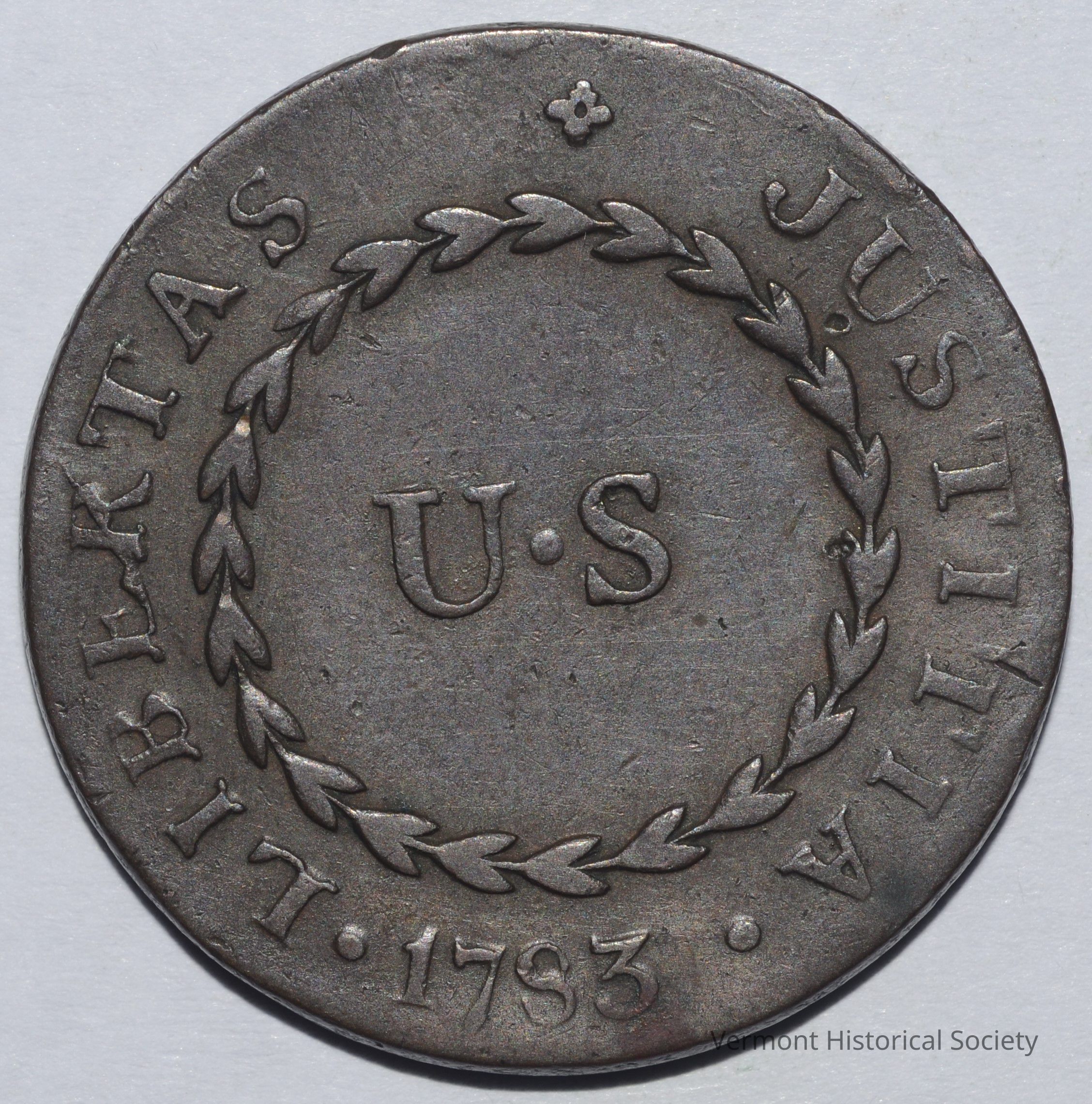 Copper coin. The obverse is stamped with a laurel wreath around the letters "U.S" and surrounded by the words, "LIBERTAS JUSTITIA 1783". The reverse is stamped with an image of an eye with several lines and stars radiating from it and the words "NOVA CONSTELATIO [sic]".