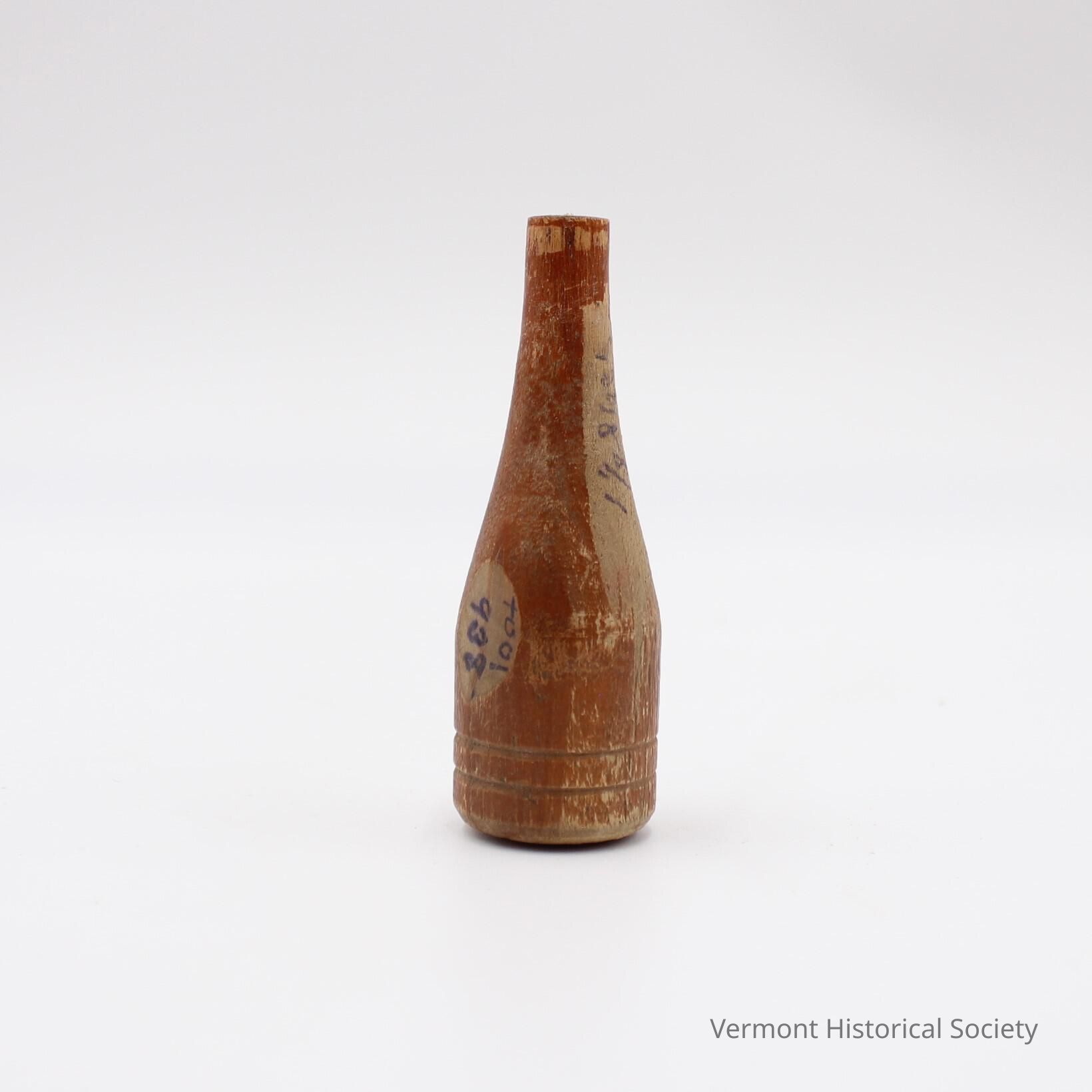Small, red-painted teardrop-shaped wooden form with two rings inscribed near the base. There are two inked inscriptions with notes about the size.Context