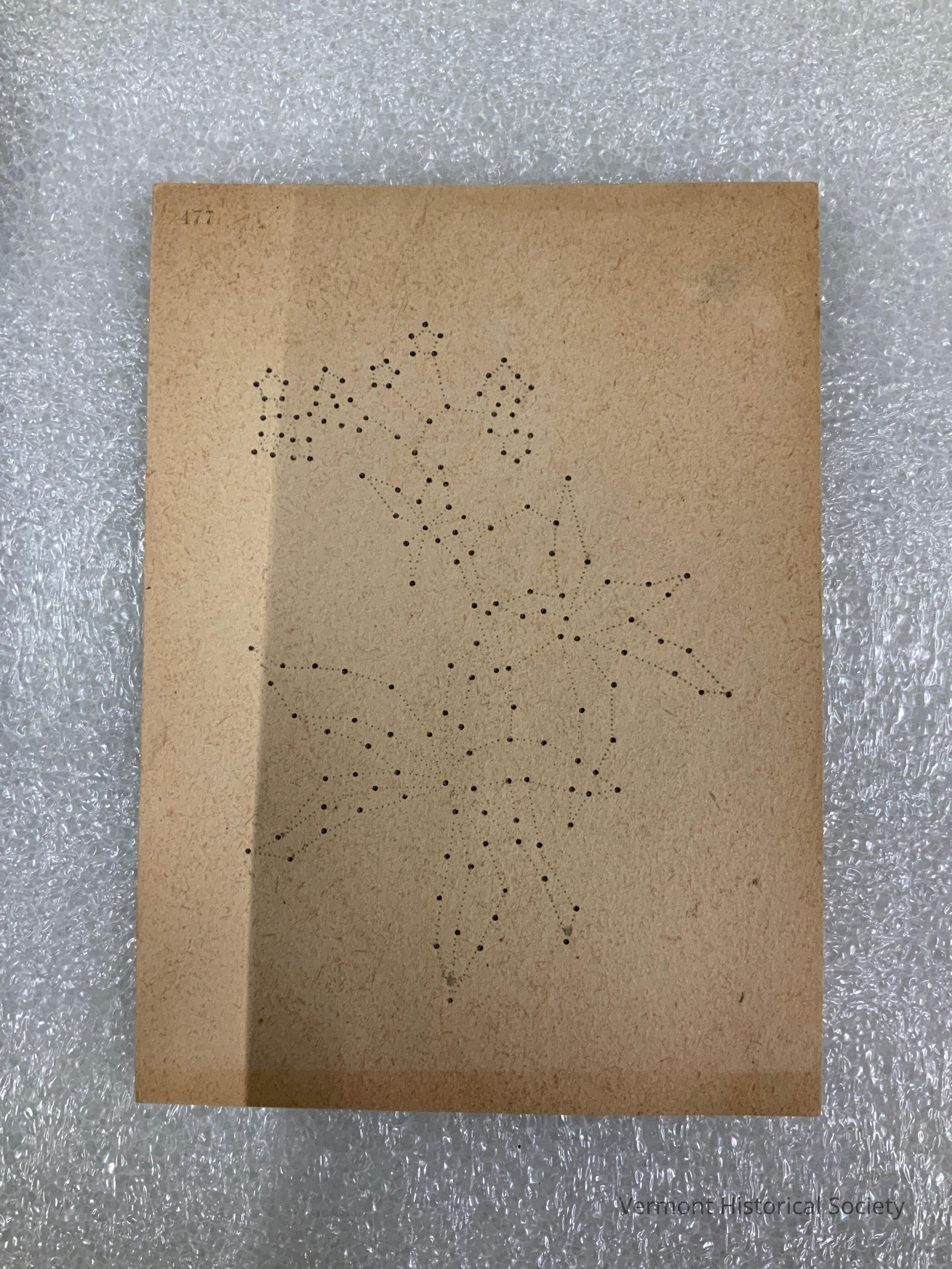 Rectangular cardboard sewing card printed on one side with a dotted line drawing of a stem of flowers with dramatically pointed petals. There are small holes punched along each line.Context