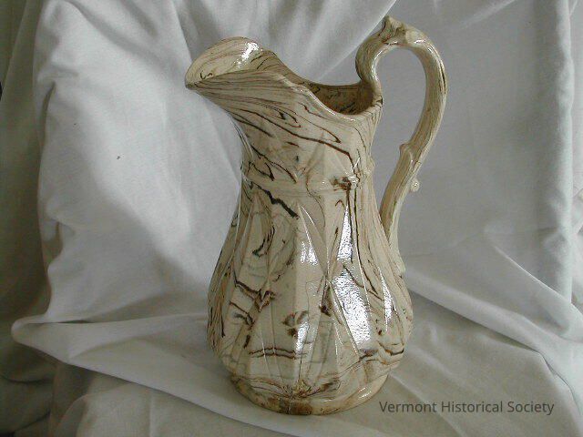 Ceramic wash pitcher with salt glaze and marbled body. The pitcher is molded in diamond-shaped facets.