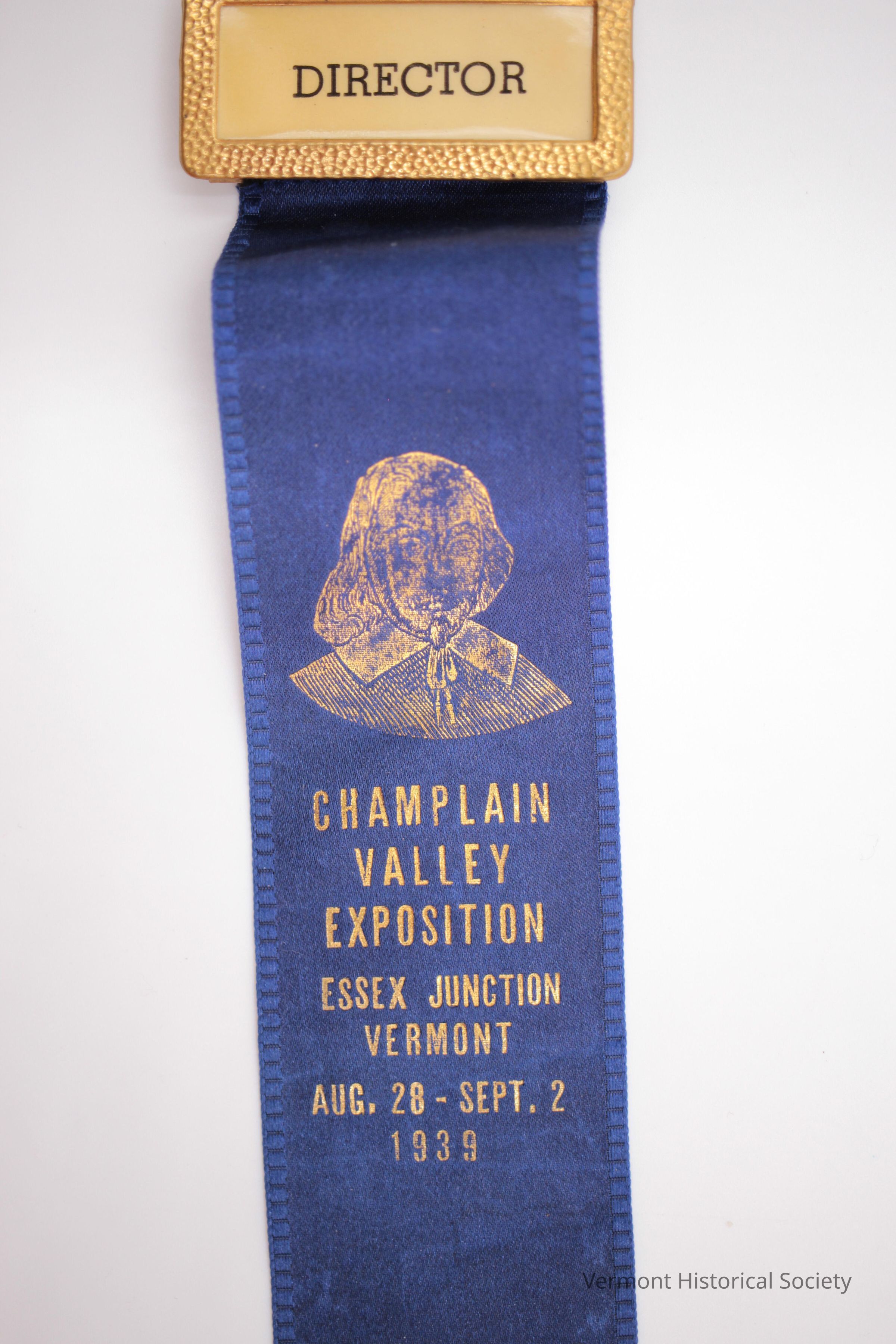 Blue ribbon printed in gold with an image of a man in 17th century clothing (Samuel de Champlain) and the inscription, "CHAMPLAIN VALLEY EXPOSITION ESSEX JUNCTION VERMONT AUG. 28-SEPT. 2 1939". The top of the ribbon is attached to a gold-framed name tag that reads, "DIRECTOR", and has a pin on the back.