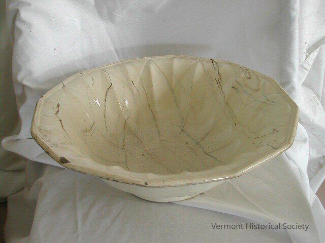 Marbled ceramic washbasin. The sides of the bowl are fluted.