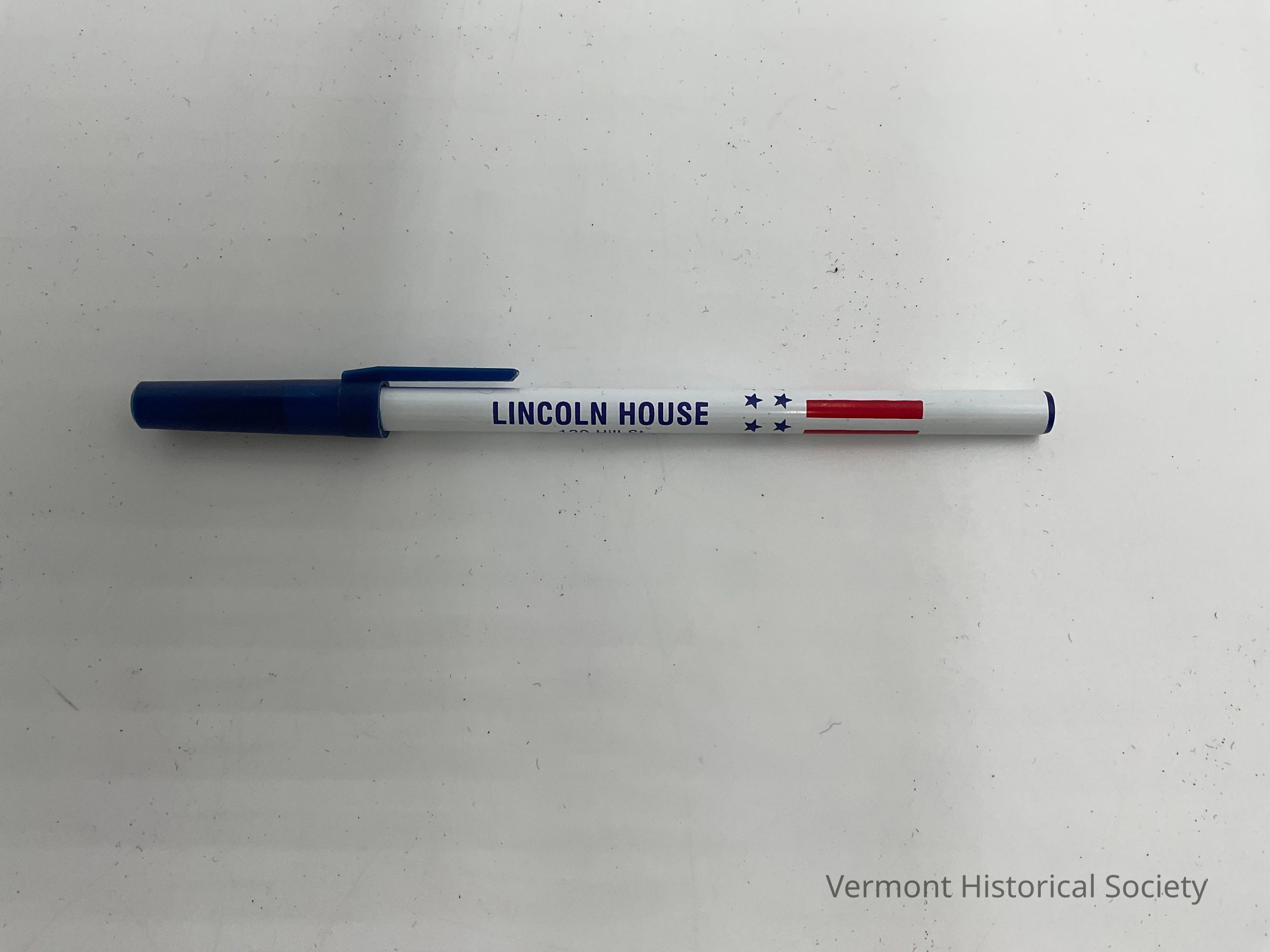 White pen with a blue cap and red stripes and blue stars plus the following printed on the stem: Lincoln House, 120 Hill St., Barre, Vt. 05641. (802) 476-3283, Promoting independence."Context