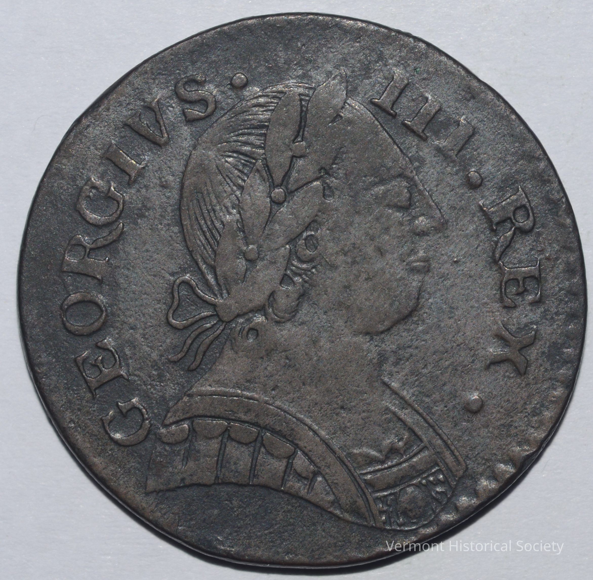 Machin's Mills imitation British halfpenny. The obverse is struck with an image of a Roman bust facing right and the words, "GEORGIUS III REX" around the edge. The reverse is struck with an allegorical woman draped in fabric holding a stem of wheat and staff, seated beside a shield bearing the English flag. The word "BRITANNIA" is around the edge and the date 1787 is at the center bottom.