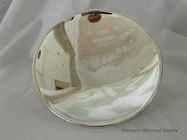 Mercury glass kerosene lamp reflector. It is a round, concave dome.