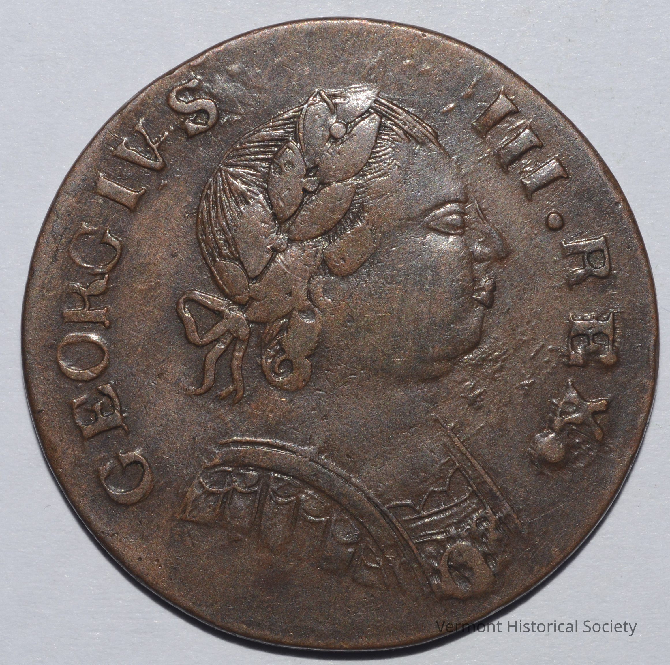 Machin's Mills imitation British halfpenny. The obverse is struck with an image of a Roman bust facing right and the words, "GEORGIUS III REX" around the edge. The reverse is struck with an allegorical woman draped in fabric holding a stem of wheat and staff, seated beside a shield bearing the English flag. The word "BRITANNIA" is around the edge and the date 1787 is at the center bottom.