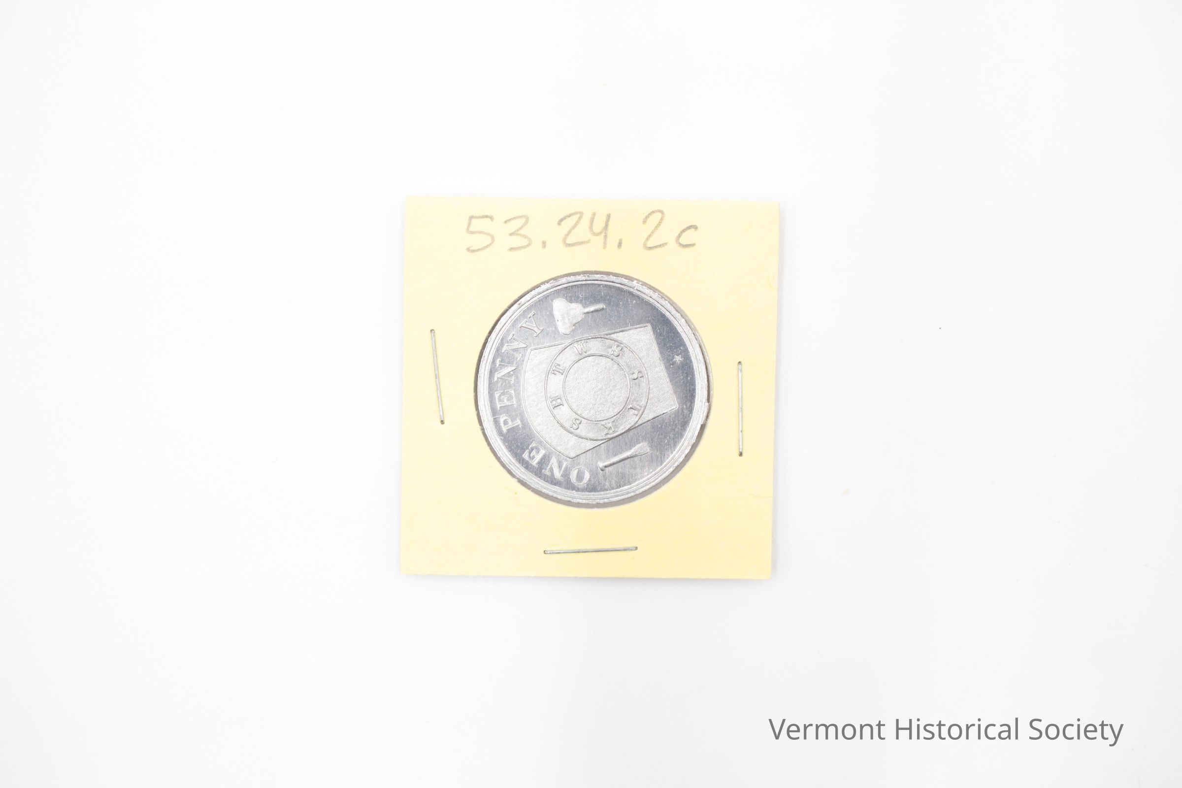 Aluminum token the words "ONE PENNY" on the obverse with an olive branch at the bottom, a tablet with a circle of initials "H T W S S T K S" in the center, a chisel, and a funnel. On the other side of the coins are the words, "Cleveland Chapter No. 20 R.A.M. Newport, Vt."Use