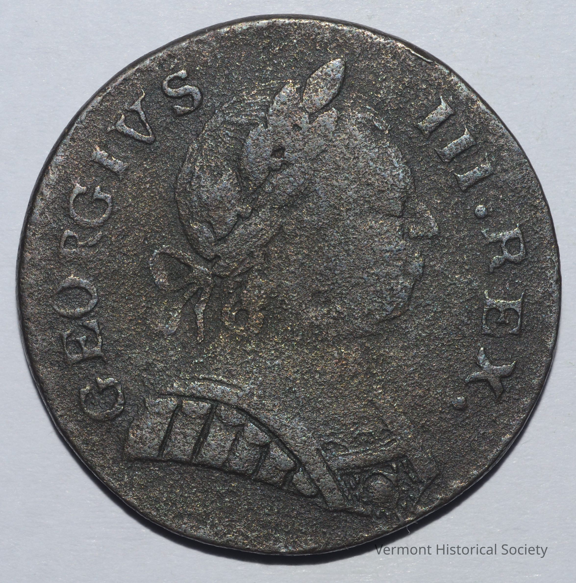 Machin's Mills imitation British halfpenny. The obverse is struck with an image of a Roman bust facing right and the words, "GEORGIUS III REX" around the edge. The reverse is struck with an allegorical woman draped in fabric holding a stem of wheat and staff, seated beside a shield bearing the English flag. The word "BRITANNIA" is around the edge and the date 1787 is at the center bottom.