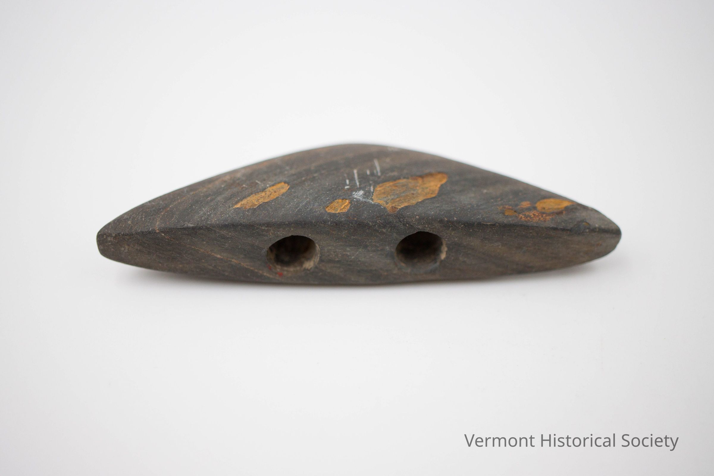 Triangular, ground slate pendant. There are 2 drilled holes going from the bottom to the top of the triangle, and graduating in size.