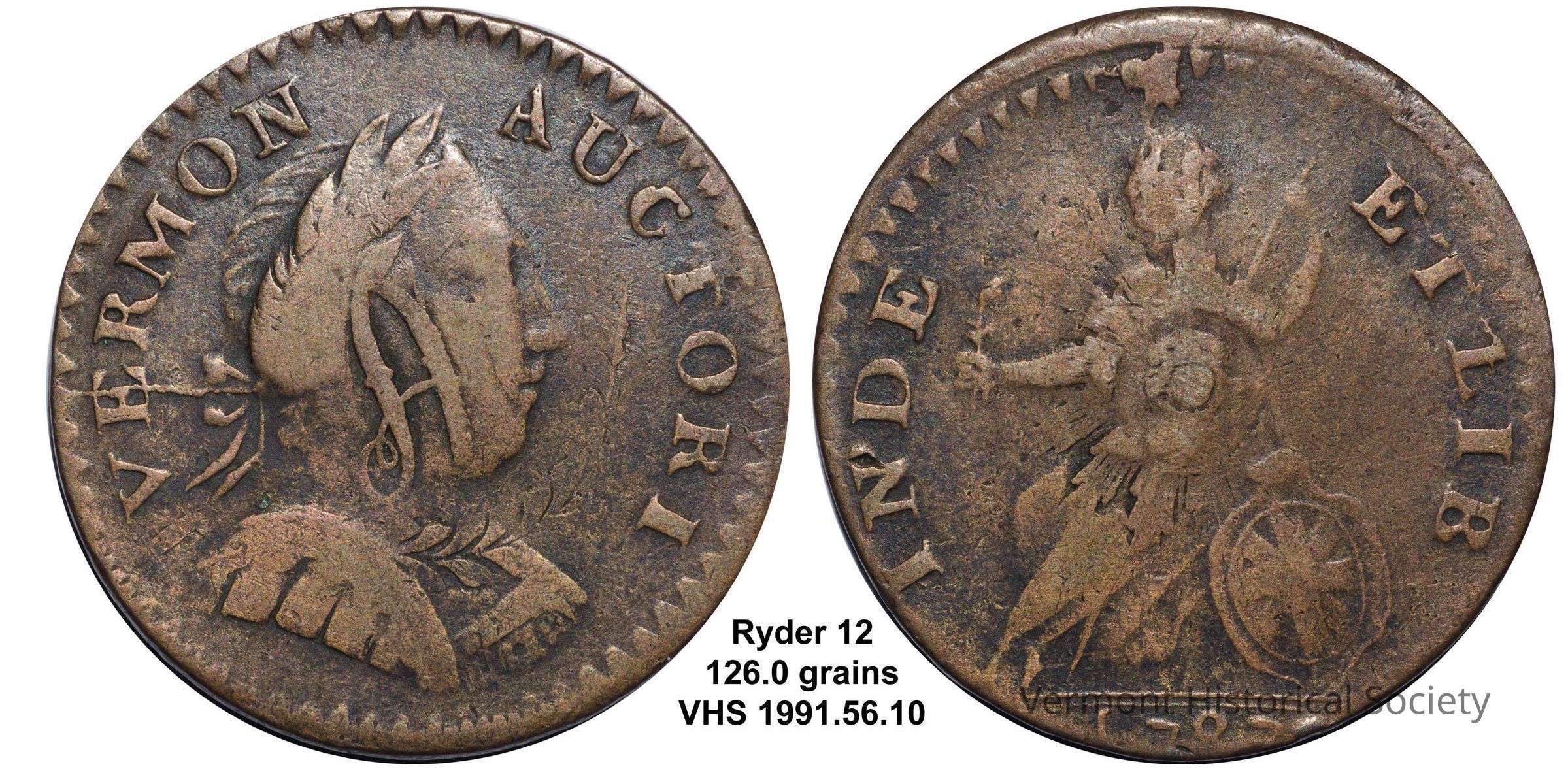 Copper coin with a bust on one side and the allegorical figure, Columbia, on the other. The face side shows a right-facing bust of a Roman figure, wearing a laurel wreath on his head, tied with a ribbon at the nape of his neck, and military armor. The words "VERMON AUCTORI" ring the edge. On the reverse, Columbia is shown swathed in loose fabric, seated next to a shield bearing the Union flag. She is holding a staff with a liberty cap in her left hand, and a small branch in her right hand. The date 1787 is at the center bottom. The coin is struck onto a 1785 Nova Constallatio coin, making it appear as if there is an "A" on the bust and an eye on Columbia's stomach.Acquisition