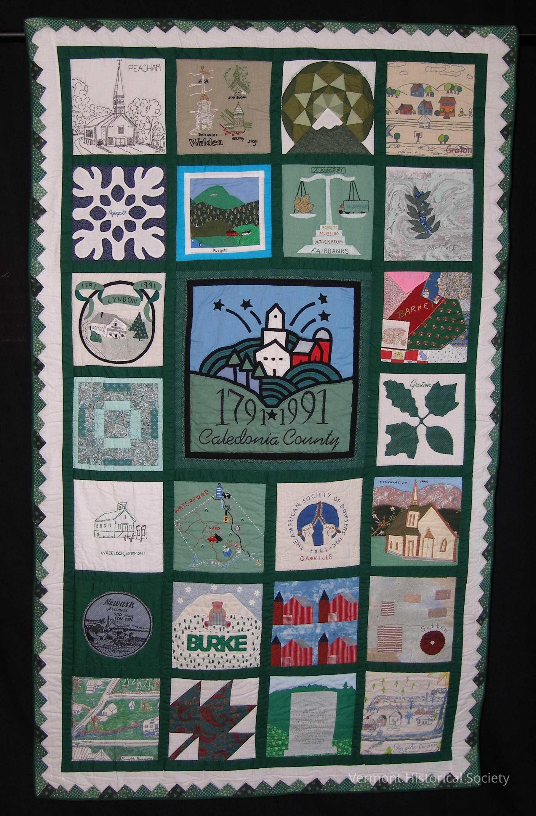 Vermont statehood bicentennial quilt, Caledonia county. The quilt consists of a central square block depicting a variation of the Vermont bicentennial logo altered to be more closely represent Caledonia County. The block is surrounded by Twenty-four 8 x 8" blocks that each use different techniques, including piecing, applique, embroidery, and drawing. The blocks are set in bands of plain dark green, a the quilt is bordered in white with a pieced green edge. The backing is green floral calico. A panel on the reverse has the names of the makers mapped to their corresponding blocks. Both machine and hand stiching is used.Context