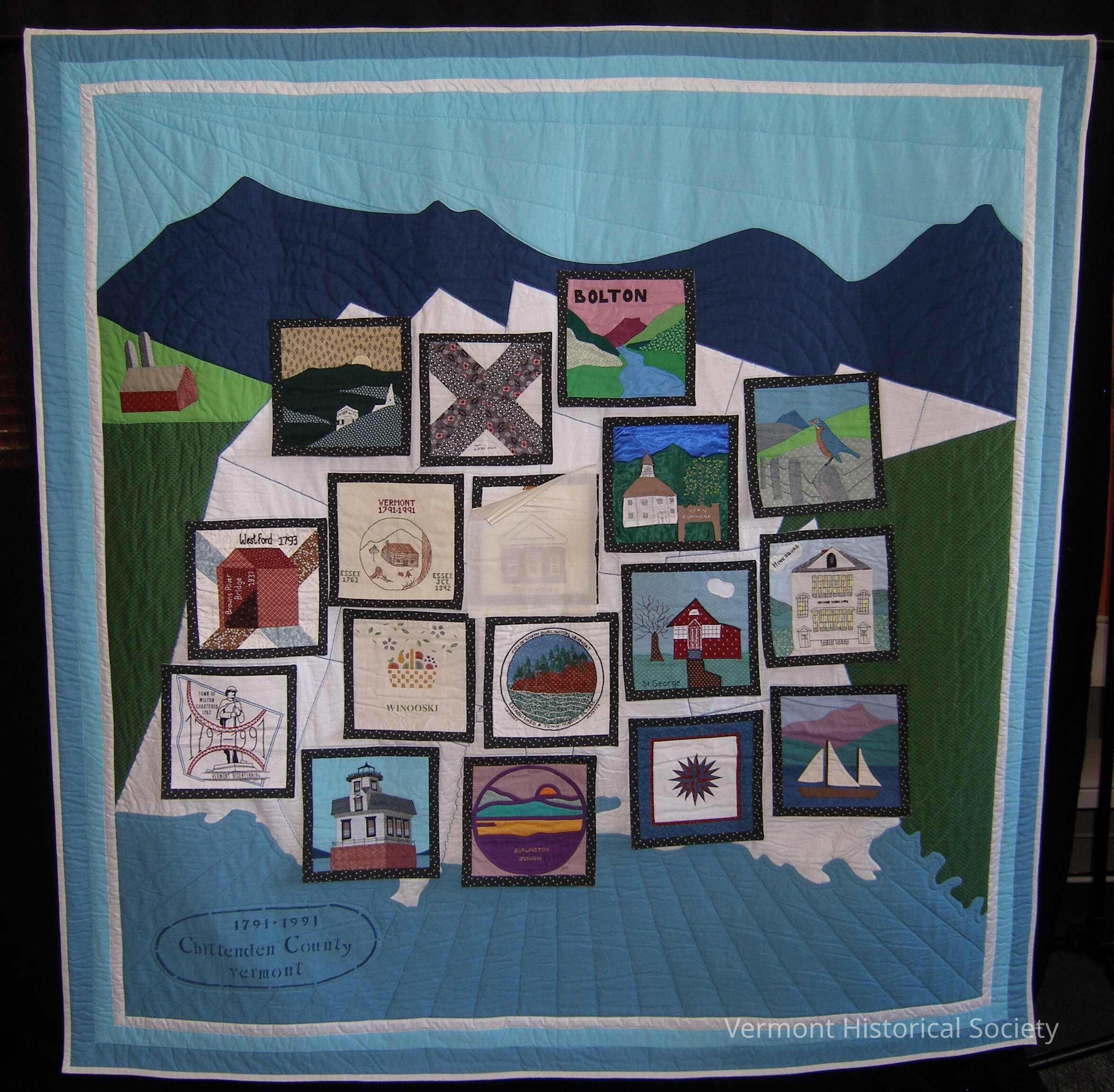Pieced quilt made up of seventeen pictorial blocks placed irregularly over a large, pieced and embroidered map of Chittenden County Each block is attached only at the top, leaving it like a flap. Each block represents a town in Chittenden County, showing images of buildings, icons, or scenes from the town and utilizing several different techniques, including piecing, applique, embroidery, painting, and stenciling.Context