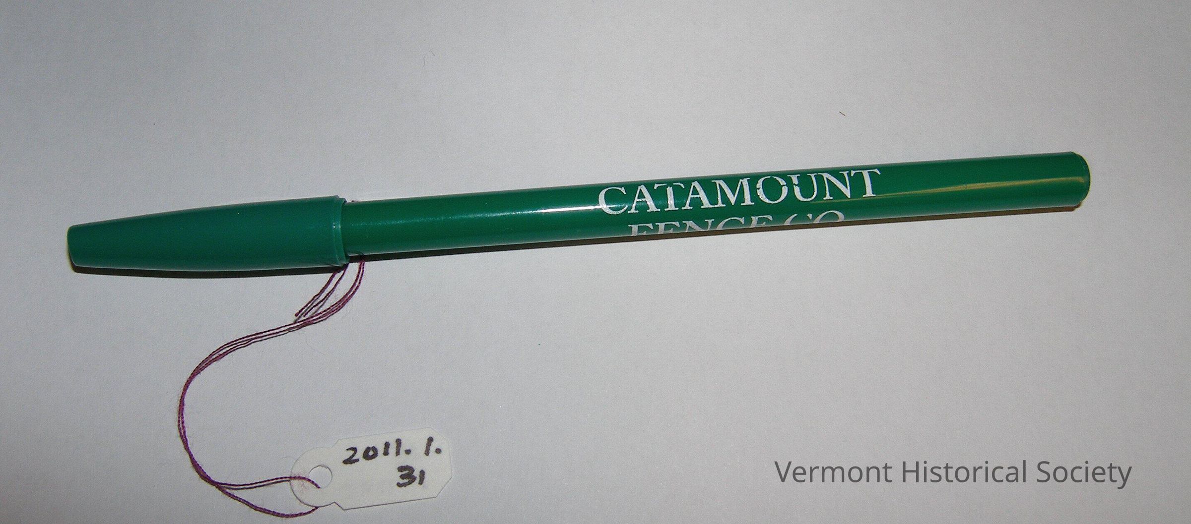 Green plastic ballpoint pen with cap. The pen bears the white printed inscription, "CATAMOUNT FENCE CO. Cornwall VT - 802 462 3380".