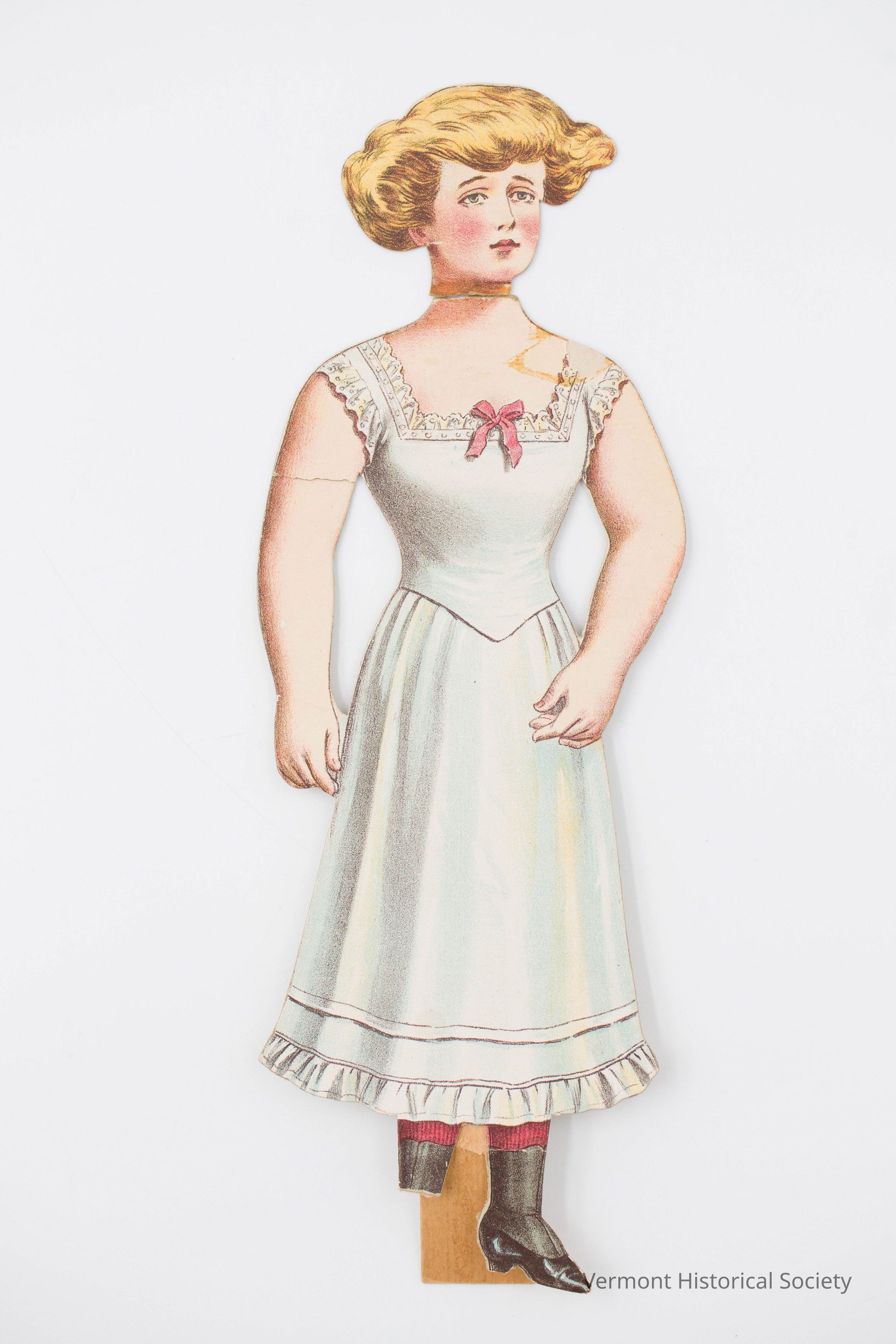 Large, paperboard doll. The doll is wearing white undergarments consisting of a camisole and petticoat. She is also wearing black boots and red stockings. The doll's right food and head are detached, and it has blond hair.Context