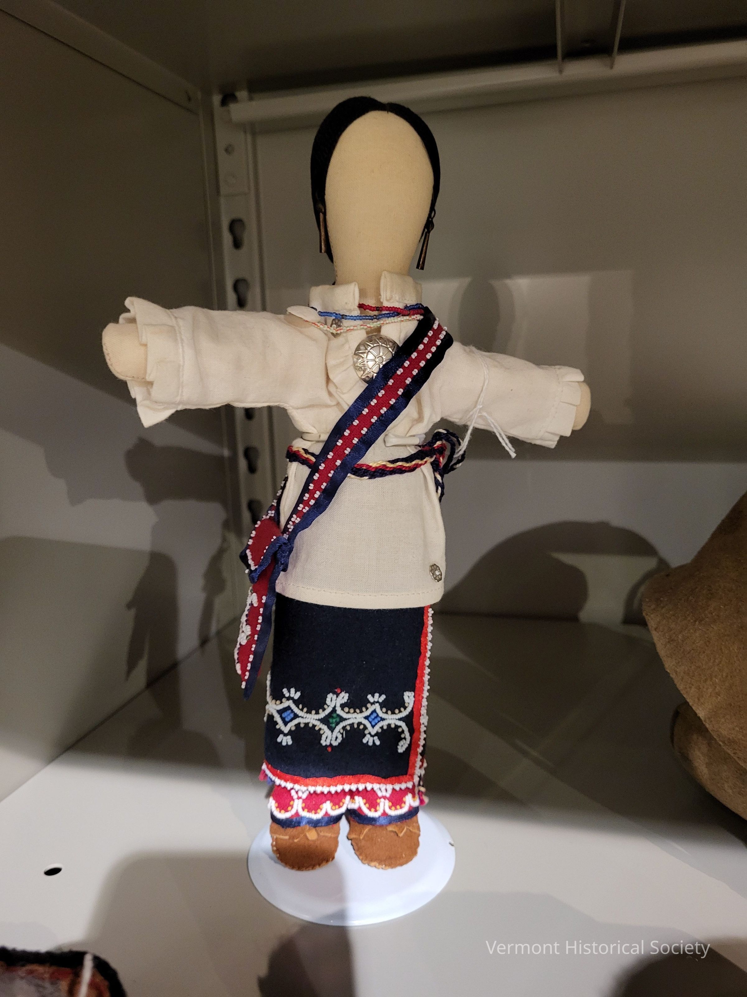 Fabric doll. The doll is made of fabric with no facial features, black hair, and a white tunic with pleated cuffs. There is a blue and red bag slung across one shoulder and across the doll's torso, and the doll has a dark blue beaded skirt with moccasins underneath.Acquisition