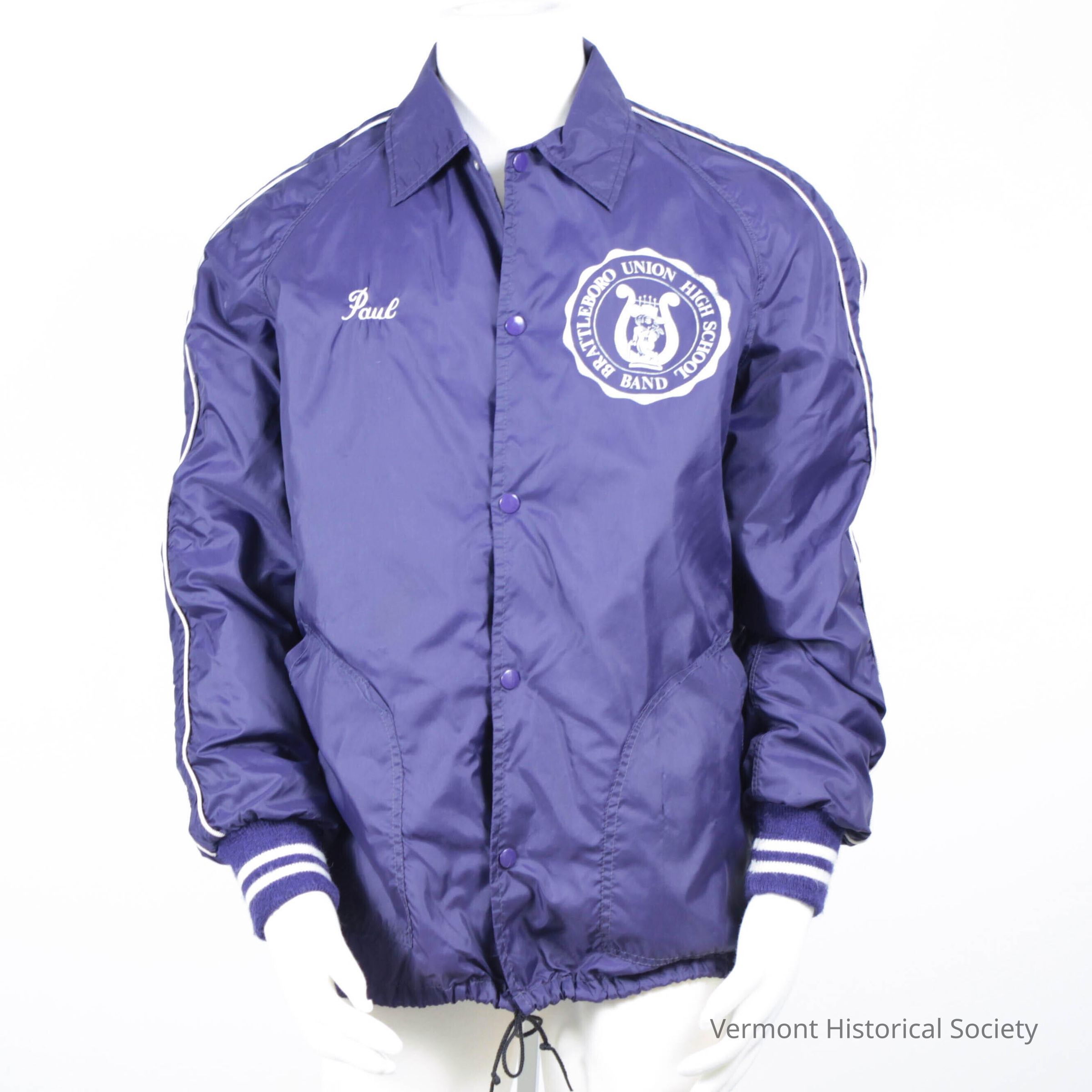 Blue nylon windbreaker jacket. The jacket is lined in black fleece and has knitted cuffs. It opens down the center front and secures with 5 snaps. The hem tightens with a drawstring. The left breast has a printed insignia of a man in a large cowboy hat leaning on a cane in front of a lyre surrounded by the inscription "BRATTLEBORO UNION HIGH SCHOOL BAND". The right breast is embroidered with the name Paul. A large tag at the back neckline reads, "ID IDENTITY APPAREL MACMILLAN WARD, INC. NEW LONDON, OHIO 44851".Context