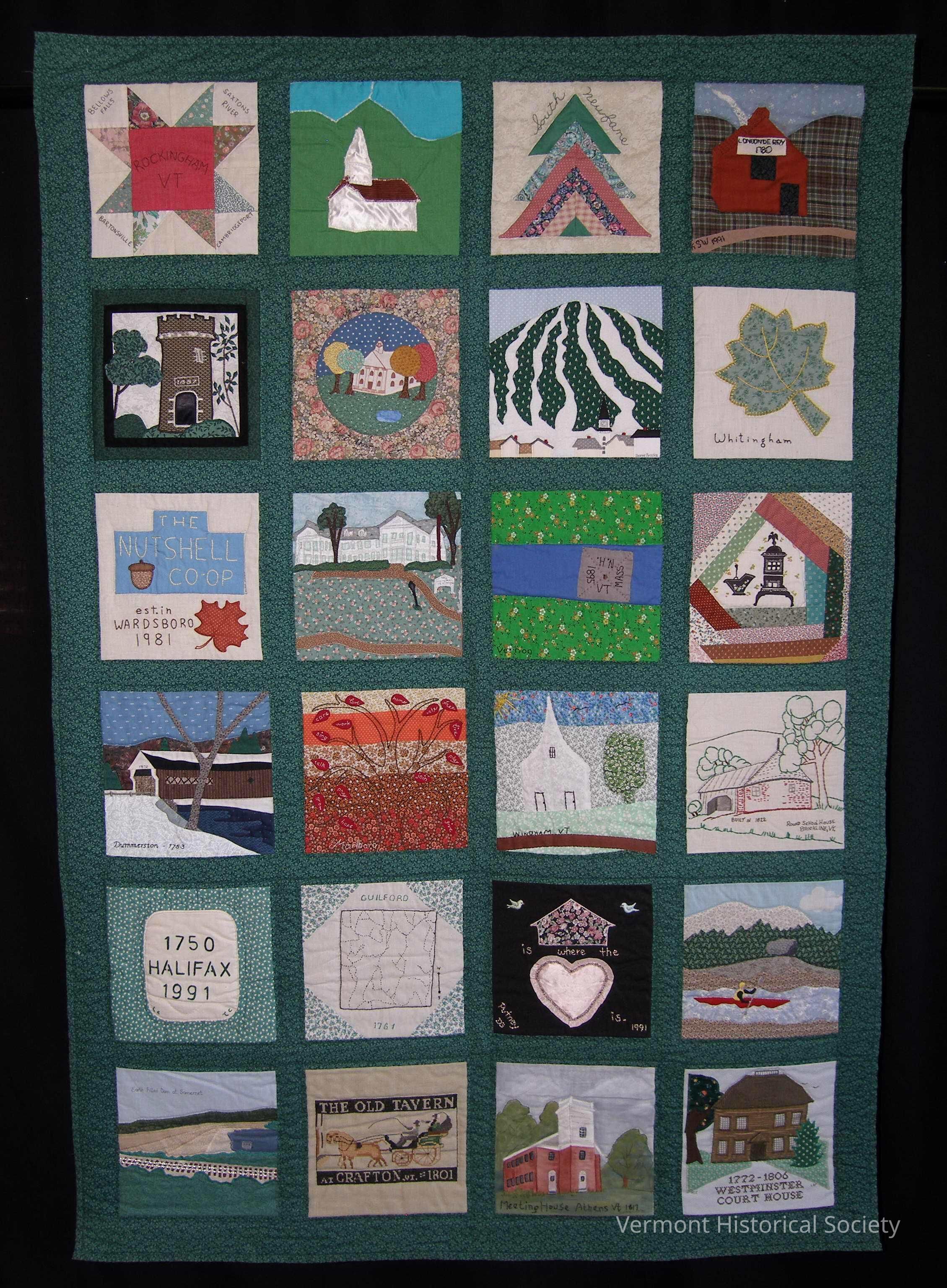 Pieced quilt with 24 pictorial blocks. The blocks show a church, a school, a castle tower, ski trails, a maple leave, a wood heating stove, a covered bridge, a map, business logos, and various other buildings in Windham County, VT. The blocks are separated by green calico sashing. The top left block is embroidered with the names of the towns in Windham County.Context