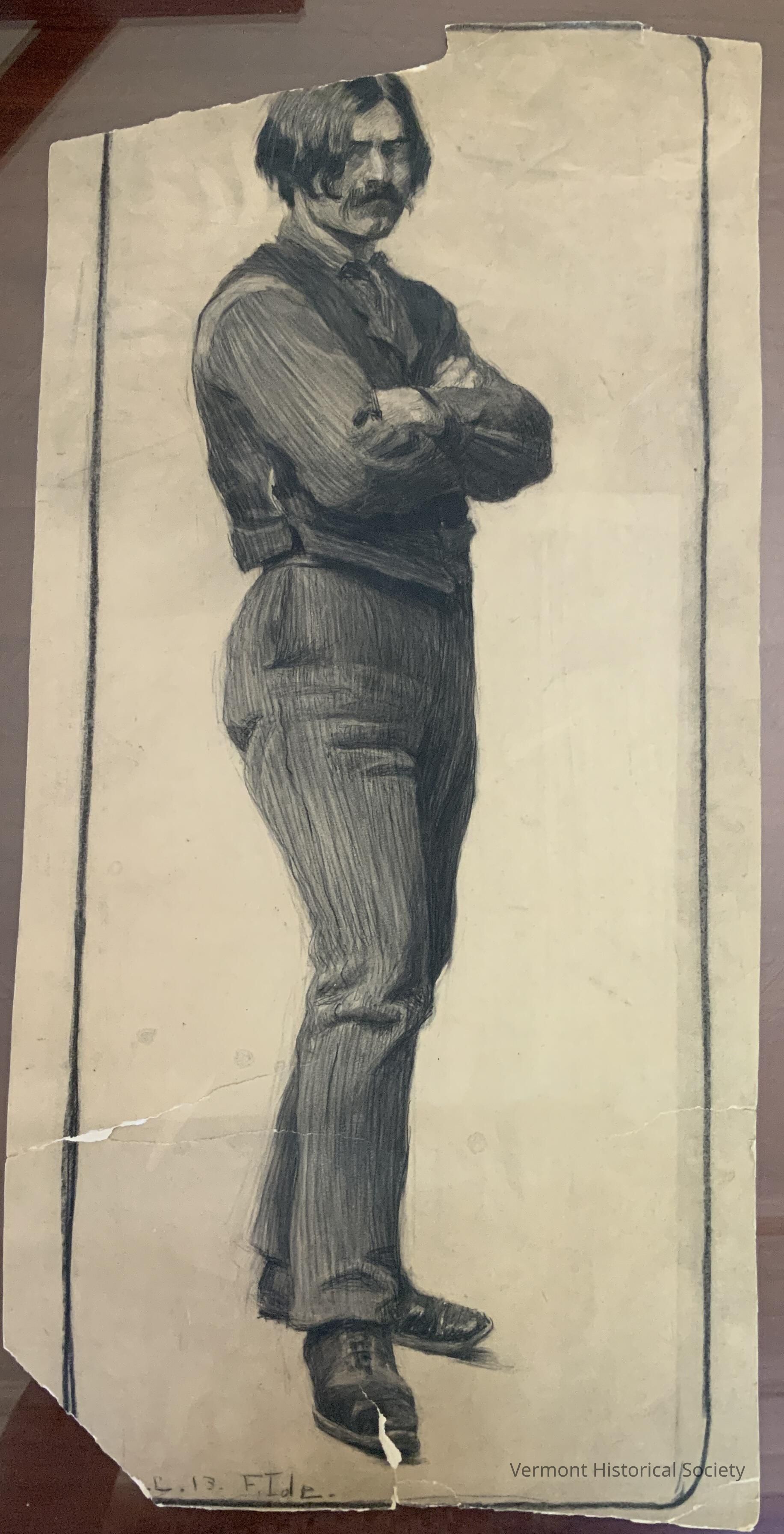 A full length drawing of a man in a shirt, vest, tie, and striped pants. He has dark hair and a mustache and looks bitter. It is signed in the bottom left corner and has a date that got ripped off.Type of Drawing