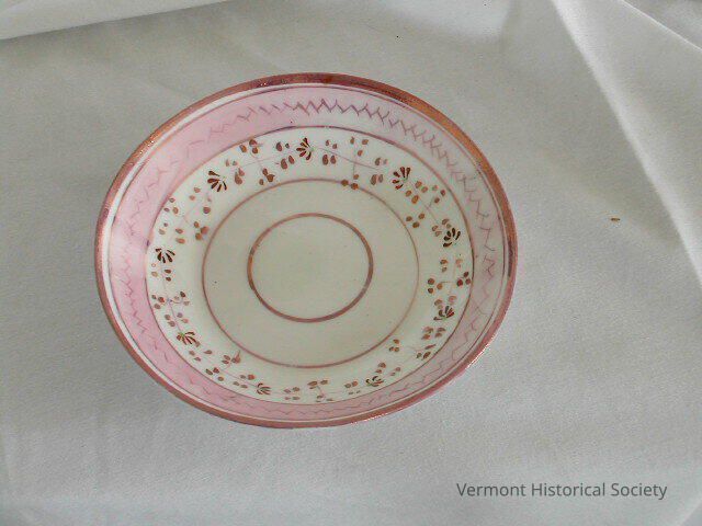 White-bodied ceramic saucer with pink luster abstract floral design. The design consists of concentric pink luster circular bands. Within the outermost two bands are a hatched or chevron-shaped vine and a more naturalistic vine with pink leaves and red-petaled flowers.